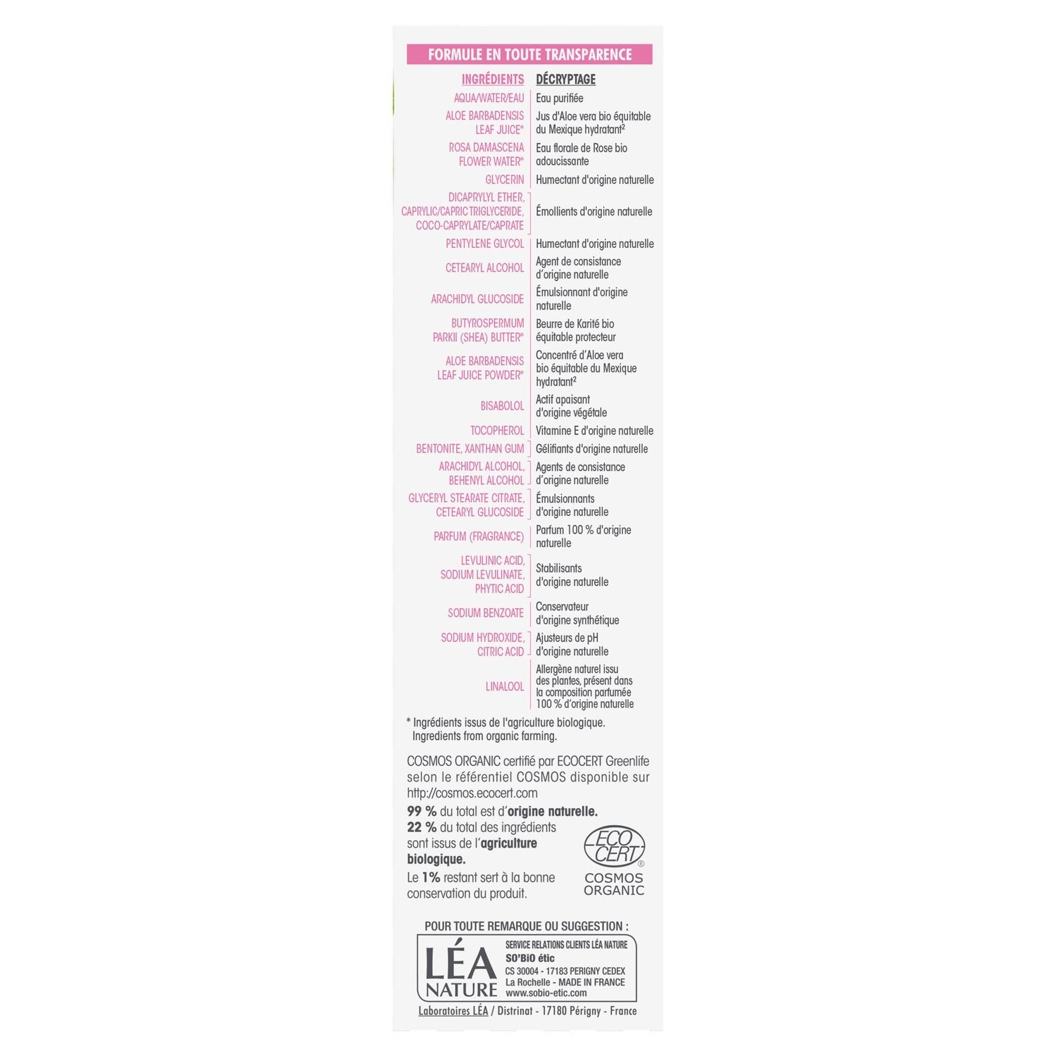 Inhaltsstoffe: AQUA/WATER/EAU, ALOE BARBADENSIS LEAF JUICE*, ROSA DAMASCENA FLOWER WATER*, GLYCERIN, DICAPRYLYL ETHER, CAPRYLIC/CAPRIC TRIGLYCERIDE, COCO-CAPRYLATE/CAPRATE, PENTYLENE GLYCOL, CETEARYL ALCOHOL, ARACHIDYL GLUCOSIDE, BUTYROSPERMUM PARKII (SHEA) BUTTER*, ALOE BARBADENSIS LEAF JUICE POWDER*, BISABOLOL, TOCOPHEROL, BENTONITE, SODIUM LEVULINATE, PHYTIC ACID, SODIUM BENZOATE, SODIUM HYDROXIDE, CITRIC ACID, LINALOOL. *Inhaltsstoffe aus biologischem Anbau. Inhaltsstoffe aus biologischem Anbau.