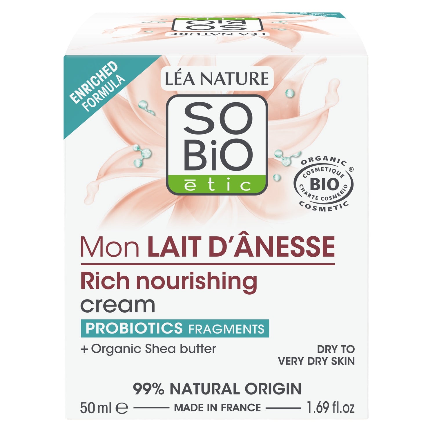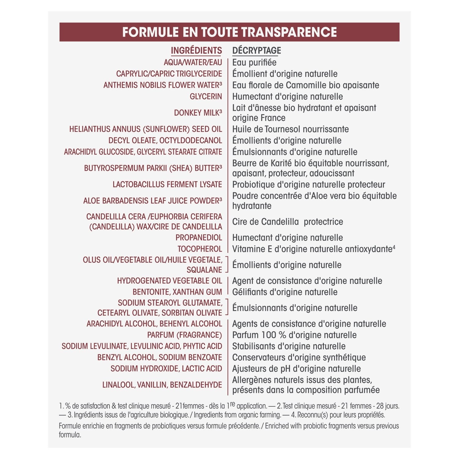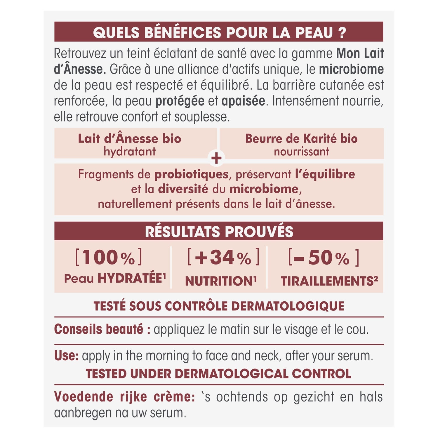 Entdecken Sie mit der Mon Lait d'Ânesse-Reihe einen strahlenden, gesunden Teint wieder. Dank einer einzigartigen Wirkstoffkombination wird das Mikrobiom der Haut respektiert und ausgeglichen. Die Hautbarriere wird gestärkt, die Haut geschützt und beruhigt. Intensiv genährt, gewinnt sie an Komfort und Geschmeidigkeit zurück. Formuliert mit: - Feuchtigkeitsspendender Bio-Eselsmilch - Nährender Bio-Sheabutter - Probiotischen Fragmenten, die das Gleichgewicht und die Vielfalt des Mikrobioms bewahren, natürlicherweise in Eselsmilch vorhanden. NACHGEWIESENE ERGEBNISSE 100 % HYDRIERTE Haut¹ +34 % NÄHRWERTE¹ -50 % SPANNUNGSFESTIGKEIT² 1. % Zufriedenheit & klinischer Test gemessen – 21 Frauen – ab der 1. Anwendung. 2. Klinischer Test gemessen – 21 Frauen – 28 Tage. NACHGEWIESENE ERGEBNISSE 100 % HYDRIERTE Haut¹ +34 % ERNÄHRUNG¹ -50 % SPANNUNGSFESTIGKEIT² 1. % Zufriedenheit & gemessener klinischer Test – 21 Frauen – ab der 1. Anwendung. 2. gemessener klinischer Test – 21 Frauen – 28 Tage. 98 % natürlichen Ursprungs. 21 % der gesamten Inhaltsstoffe stammen aus biologischem Anbau. Das restliche 1 % wird für die Produktstabilität verwendet. Unter dermatologischer Kontrolle getestet. + ETHIK: - Bio-Sektor Frankreich: SO'BiO étic® wählt Eselsmilch ausschließlich von französischen handwerklichen Bio-Eselfarmen aus. Das Sammeln von Milch für kosmetische Zwecke entzieht den Eseln nicht die Muttermilch. - 100 % recycelbarer Glasbehälter - Hergestellt in Frankreich - 1 % FOR THE PLANET-Mitglied