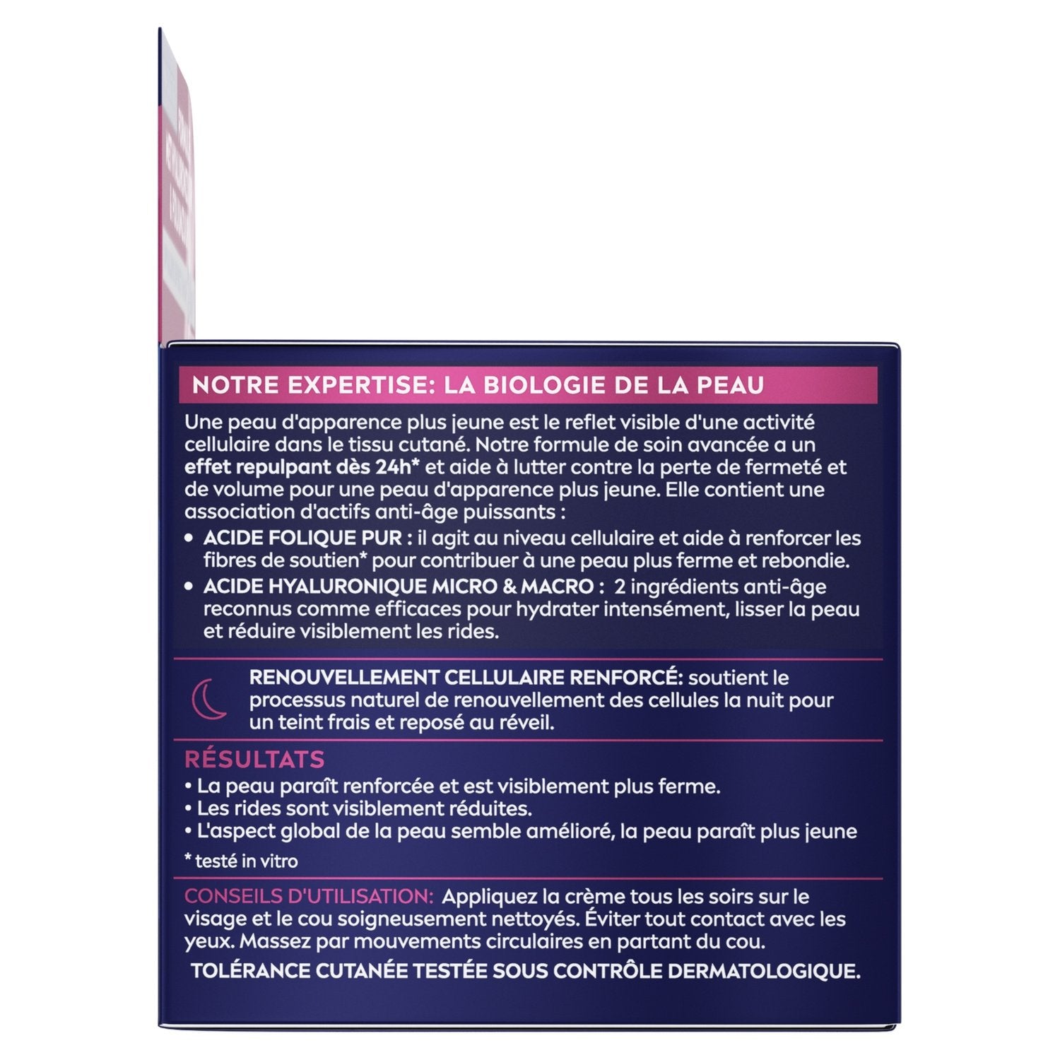 Diese Formel kombiniert leistungsstarke Anti-Aging-Wirkstoffe: . reine Folsäure: wirkt auf Zellebene und hilft, die Stützfasern zu stärken (in vitro getestet), um zu strafferer und prallerer Haut beizutragen . Mikro- und Makro-Hyaluronsäure: 2 Anti-Aging-Wirkstoffe, die dafür bekannt sind, die Haut mit Feuchtigkeit zu versorgen, zu glätten und Fältchen sichtbar zu reduzieren. Die Haut erscheint straffer und praller. Fältchen werden reduziert und das Erscheinungsbild der Haut scheint verbessert. Nach dem Aufwachen ist der Teint frisch und ausgeruht.