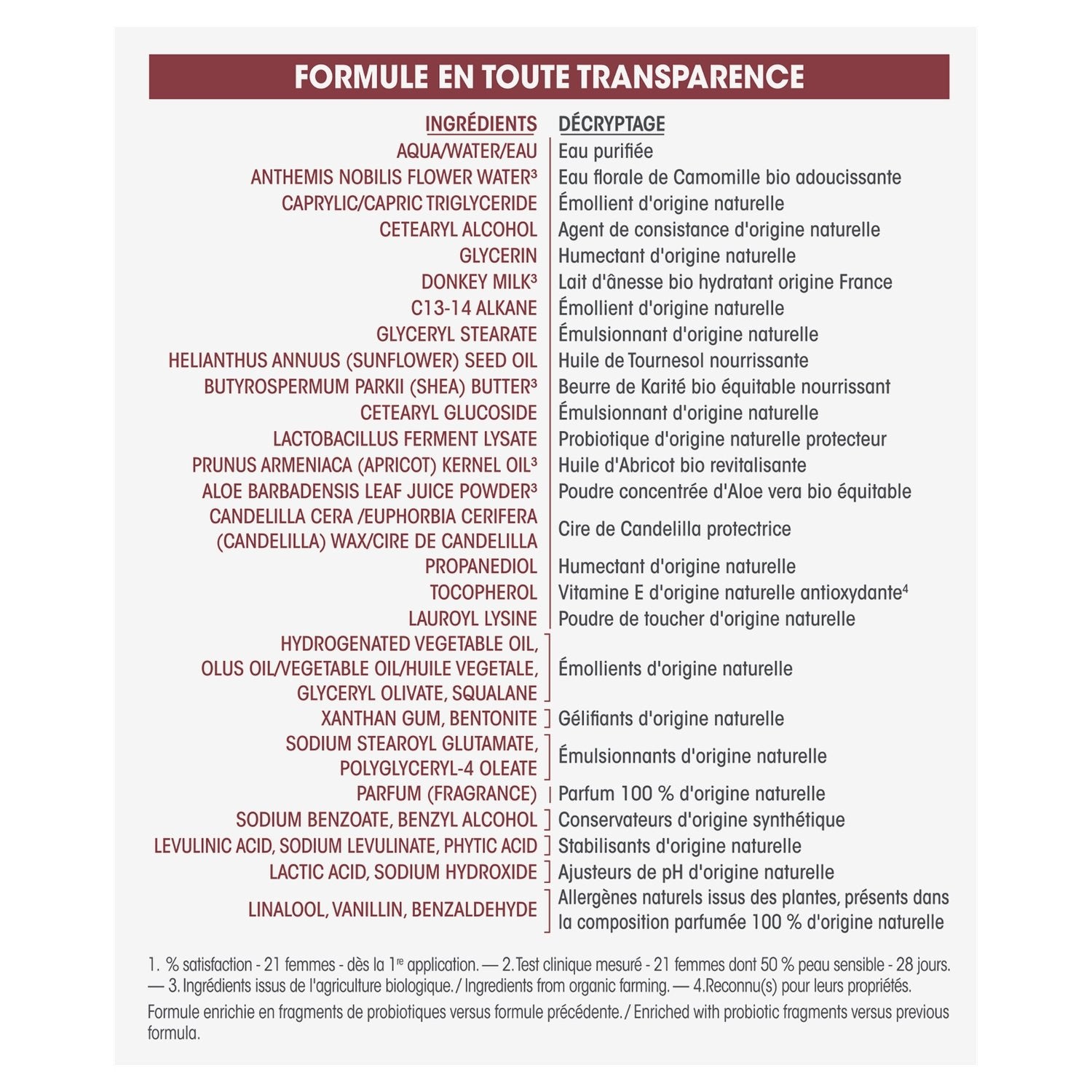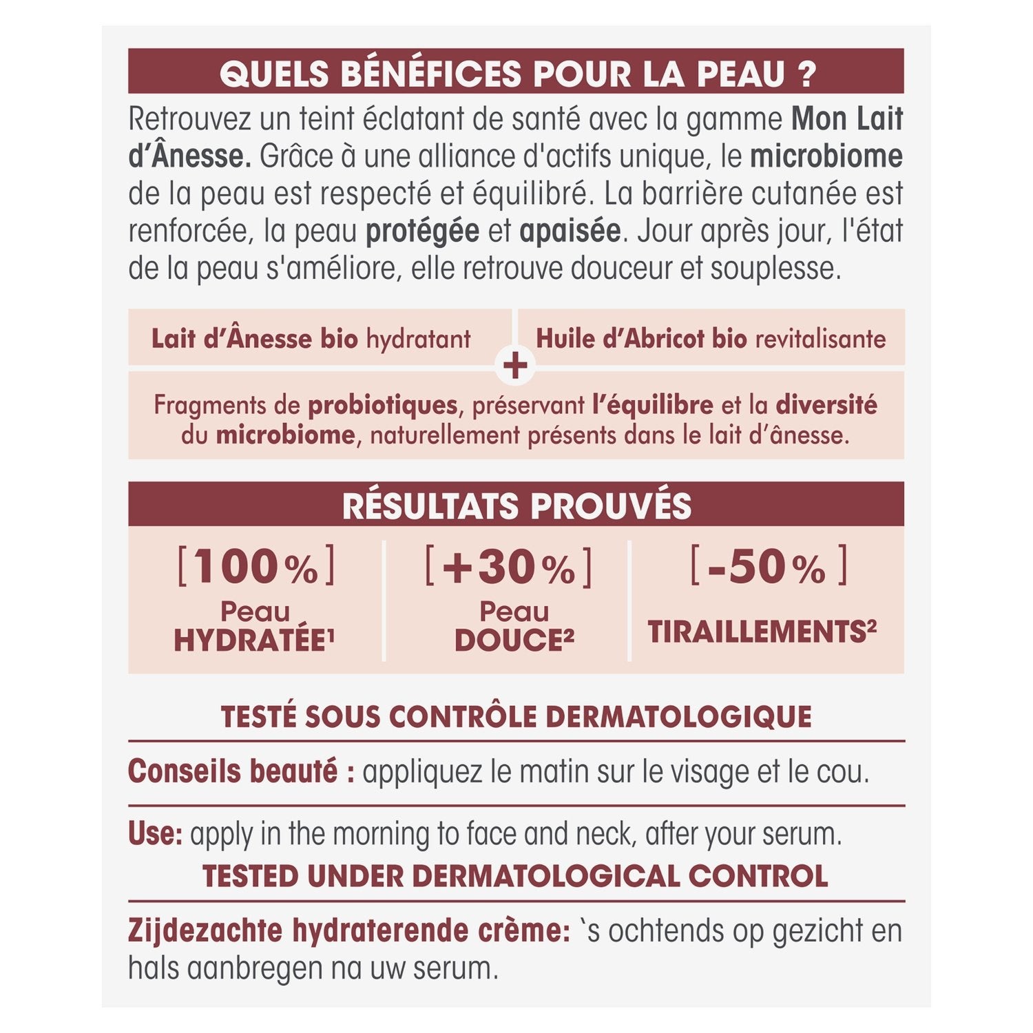 Entdecken Sie mit der feuchtigkeitsspendenden Seidencreme von Mon Lait d'Ânesse einen strahlenden, gesunden Teint wieder. Dank einer einzigartigen Wirkstoffkombination wird das Mikrobiom der Haut respektiert und ausgeglichen. Die Hautbarriere wird gestärkt, die Haut geschützt und beruhigt. Tag für Tag verbessert sich der Zustand der Haut und sie gewinnt an Weichheit und Geschmeidigkeit zurück. Formuliert mit: - Feuchtigkeitsspendender Bio-Eselsmilch - Revitalisierendem Bio-Aprikosenöl - Probiotischen Fragmenten, die das Gleichgewicht und die Vielfalt des Mikrobioms bewahren, natürlicherweise in Eselsmilch enthalten. NACHGEWIESENE ERGEBNISSE 100 % HYDRIERTE Haut¹ +30 % WEICHE Haut² -50 % SPANNUNGSGEFÜHL² 1,5 % Zufriedenheit – 21 Frauen – ab der 1. Anwendung. 2. Klinischer Test gemessen – 21 Frauen, davon 50 % mit empfindlicher Haut – 28 Tage NACHGEWIESENE ERGEBNISSE 100 % HYDRIERTE Haut¹ + 30 % WEICHE Haut² – 50 % SPANNUNGSGEFÜHL² 1,5 % Zufriedenheit – 21 Frauen – ab der 1. Anwendung. 2. Klinischer Test gemessen – 21 Frauen, davon 50 % mit empfindlicher Haut – 28 Tage COSMOS ORGANIC, zertifiziert von ECOCERT Greenlife 99 % natürlichen Ursprungs. 21 % der gesamten Inhaltsstoffe sind aus biologischem Anbau. Das restliche 1 % wird für die Produktstabilität verwendet. Unter dermatologischer Kontrolle getestet. + ETHIK: – Bio-Sektor Frankreich: SO’BiO étic® wählt Eselsmilch ausschließlich von französischen Bio-Eselfarmen aus. Das Sammeln von Milch für kosmetische Zwecke entzieht den Eseln nicht die Muttermilch – 100 % Glas – Hergestellt in Frankreich – 1 % für den Planeten