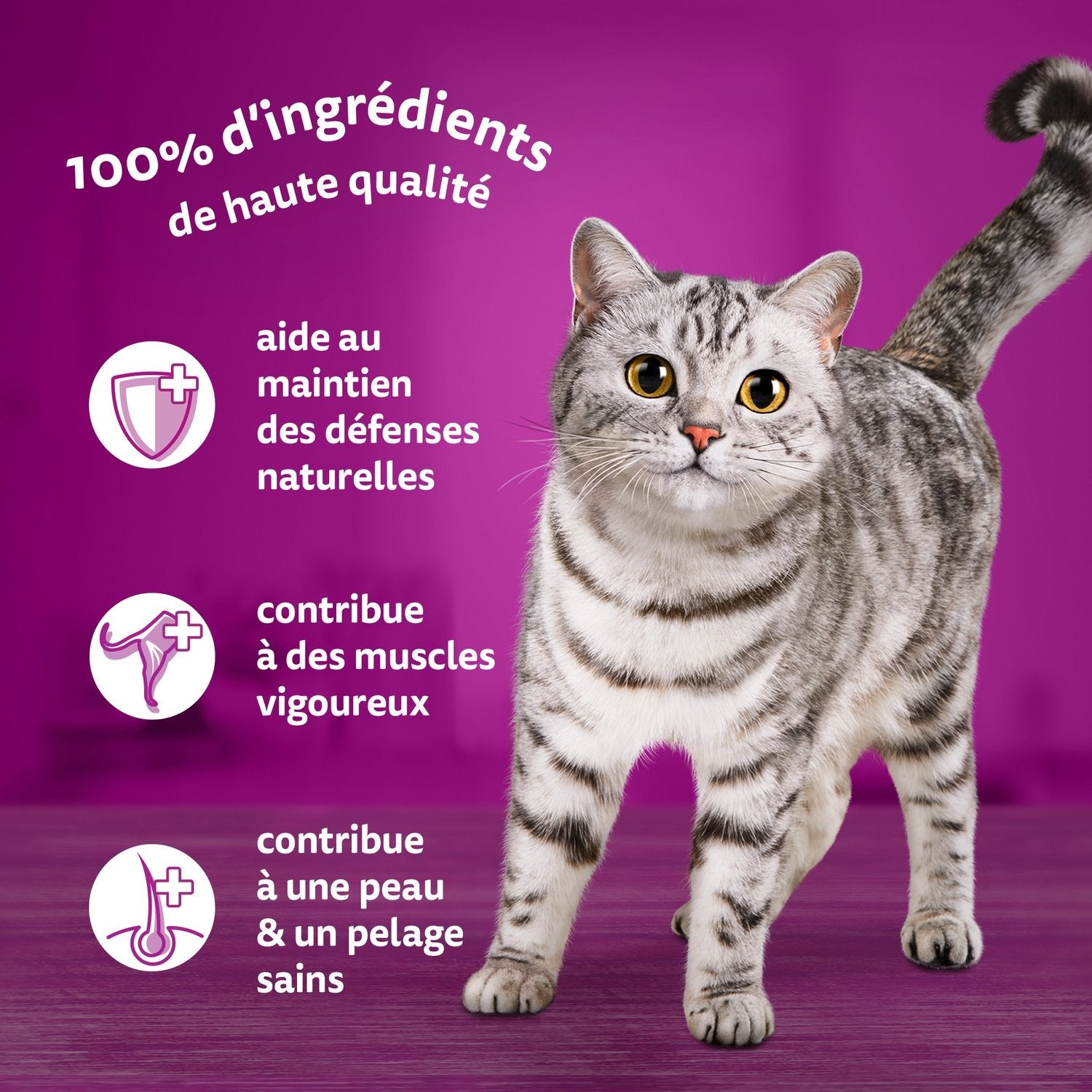 • Vollständige und ausgewogene Mahlzeit für erwachsene Katzen ab 1 Jahr – Geeignet für sterilisierte Katzen • Katzenfutter in zartem Gelee mit hochwertigen Zutaten • Unwiderstehliche Aromen, die sie vor Freude schnurren lassen (Rind/Huhn/Lachs/Thunfisch) • Trägt zu starken Muskeln, gesunder Haut und Fell bei und hilft, die natürlichen Abwehrkräfte zu erhalten • Praktischer Frischebeutel, ideal für einen sauberen Napf ohne Essensreste
