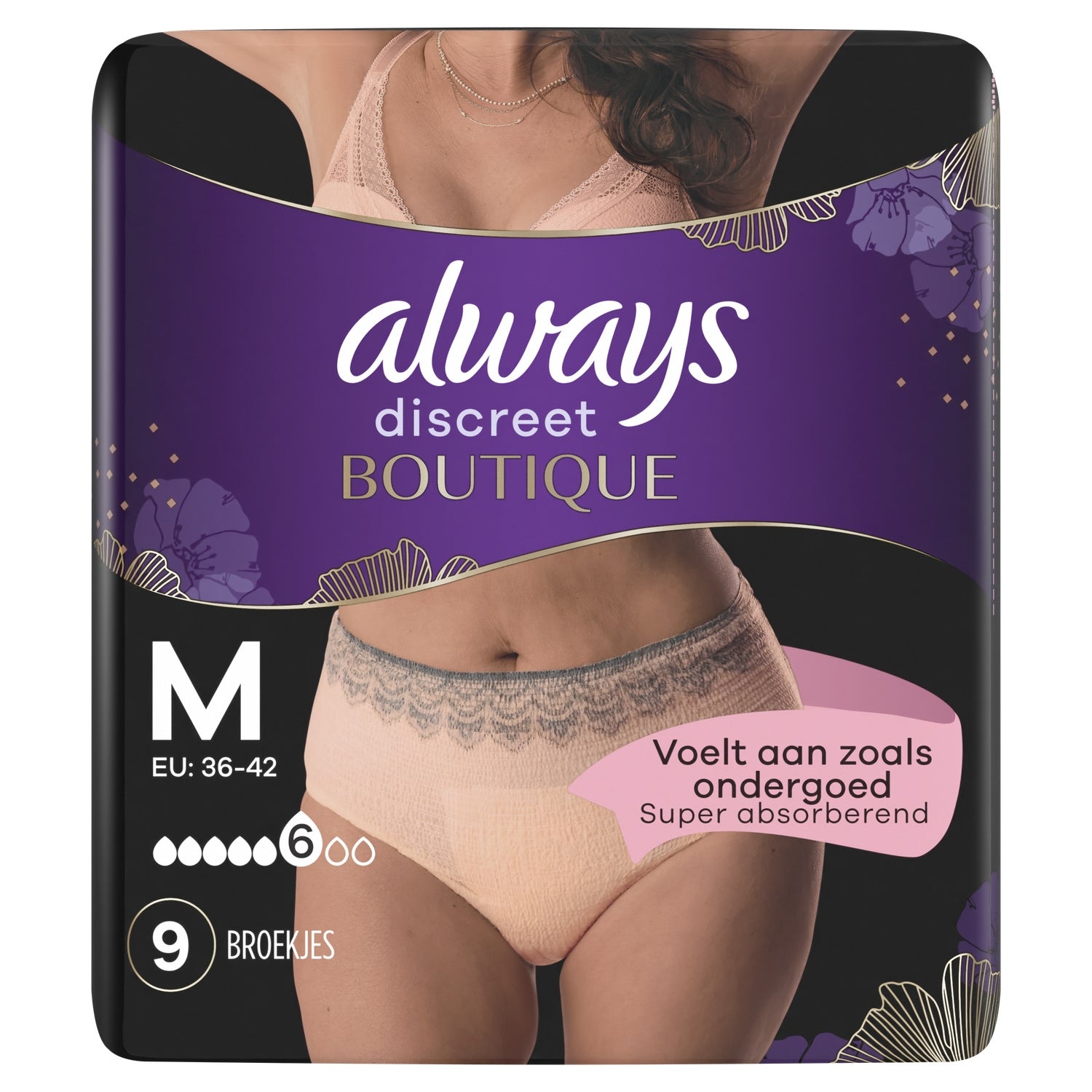 Always Discreet Boutique Inkontinenz-Slips, Beige Plus M, 9er-Pack, Echtes Unterwäschegefühl, Super saugfähig, Körperangepasstes Design