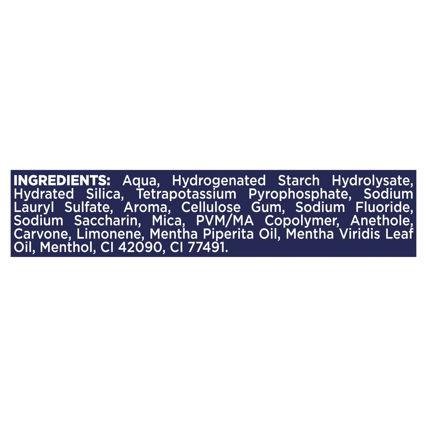 Inhaltsstoffe: Aqua, hydriertes Stärkehydrolysat, hydratisierte Kieselsäure, Tetrakaliumpyrophosphat, Natriumlaurylsulfat, Aroma, Cellulosegummi, Natriumfluorid, Natriumsaccharin, Glimmer, PVM/MA-Copolymer, Anethol, Carvon, Limonen, Mentha Piperita-Öl, Mentha Viridis-Blattöl, Menthol, CI 42090, CI 77491.