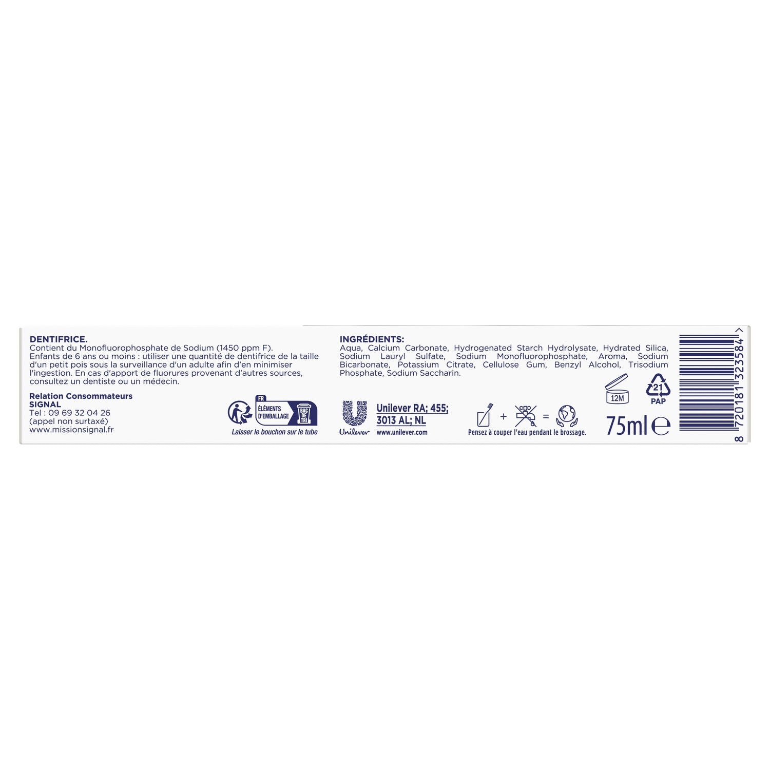 Die Signal Whitening System Bicarbonate Zahnpasta verhilft Ihnen in zwei Wochen* zu einem natürlich weißeren Lächeln. Hergestellt mit Bicarbonat und einem natürlich gewonnenen Bleichmineral reinigt diese Zahnpasta effektiv und sanft den Zahnschmelz. Angereichert mit Fluorid stärkt die Formel Ihre Zähne Tag für Tag. Die FDI erkennt an, dass zweimal tägliches Zähneputzen mit einer fluoridhaltigen Zahnpasta wie der Signal Whitening System Bicarbonate die Mundhygiene fördert. Wir bei Signal glauben, dass Ihr Lächeln Ausdruck Ihrer Persönlichkeit und Ihres Selbstbewusstseins ist. Unsere Mission: Die Mundgesundheit für alle zu verbessern, damit jeder die Kraft seines Lächelns entfalten kann. Signal unterstützt die Franzosen seit 1961, bringt ihnen schon in jungen Jahren die richtigen Gewohnheiten bei und zeigt ihnen, wie wichtig zweimal tägliches Zähneputzen, morgens und abends, ist. Wir unternehmen Schritte, um die Umweltbelastung unserer Produkte zu begrenzen. Deshalb haben wir in Zusammenarbeit mit TerraCycle® ein kostenloses Recyclingprogramm gestartet, um Ihren Zahnbürsten und Zahnpastatuben ein zweites Leben zu schenken. Mit Signal zählt jedes Lächeln! *Klinischer Fleckenentfernungstest an 54 Personen mit zweimal täglichem Zähneputzen.