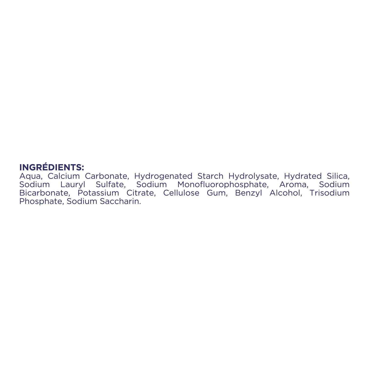 INHALTSSTOFFE: Aqua, Calciumcarbonat, hydriertes Stärkehydrolysat, hydratisierte Kieselsäure, Natriumlaurylsulfat, Natriummonofluorphosphat, Aroma, Natriumbicarbonat, Kaliumcitrat, Cellulosegummi, Benzylalkohol, Trinatriumphosphat, Natriumsaccharin.