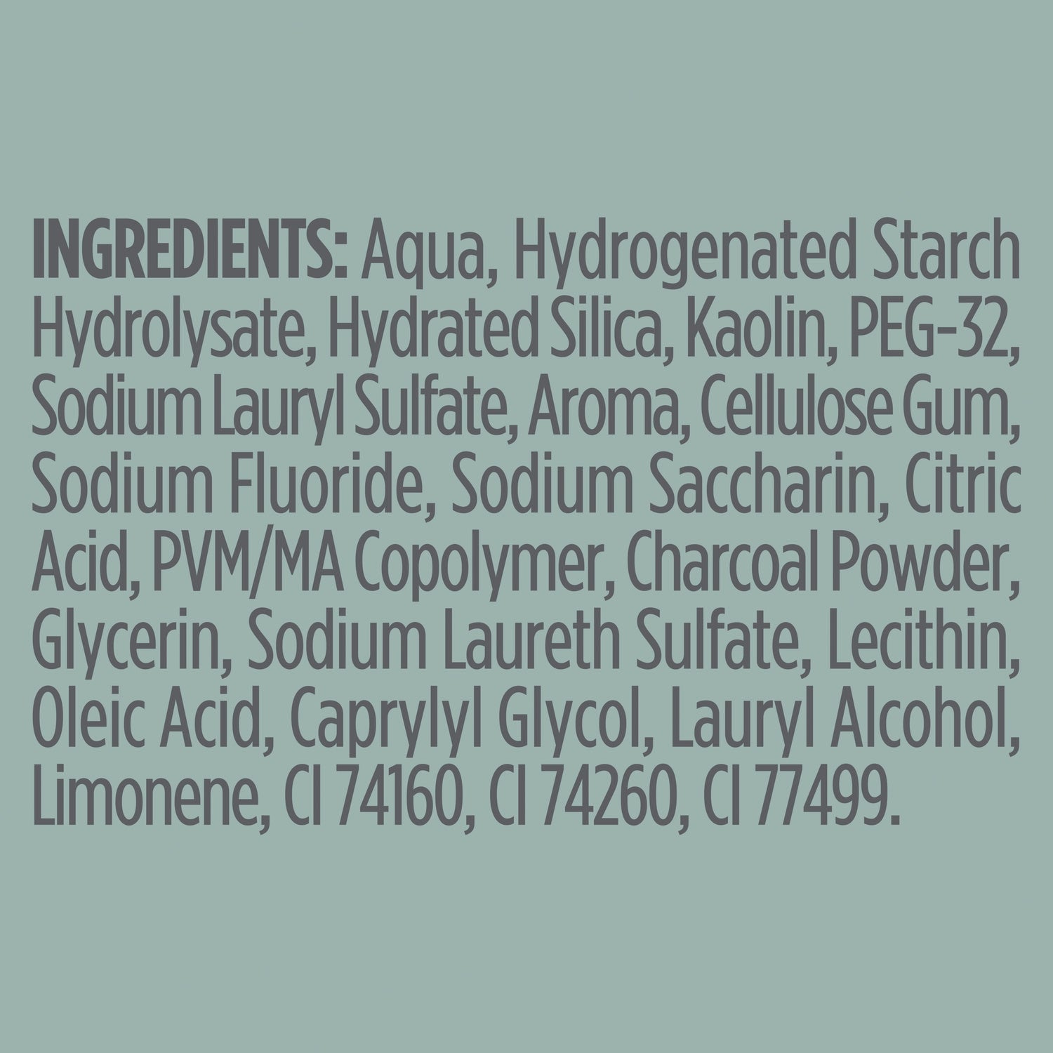 Inhaltsstoffe: Aqua, hydriertes Stärkehydrolysat, hydratisierte Kieselsäure, Kaolin, Natriumlaurylsulfat, Aroma, Cellulosegummi, Natriumfluorid, Natriumsaccharin, Zitronensäure, PVM/MA-Copolymer, Holzkohlepulver, Glycerin, Limonen, CI 74160, CI 74260.