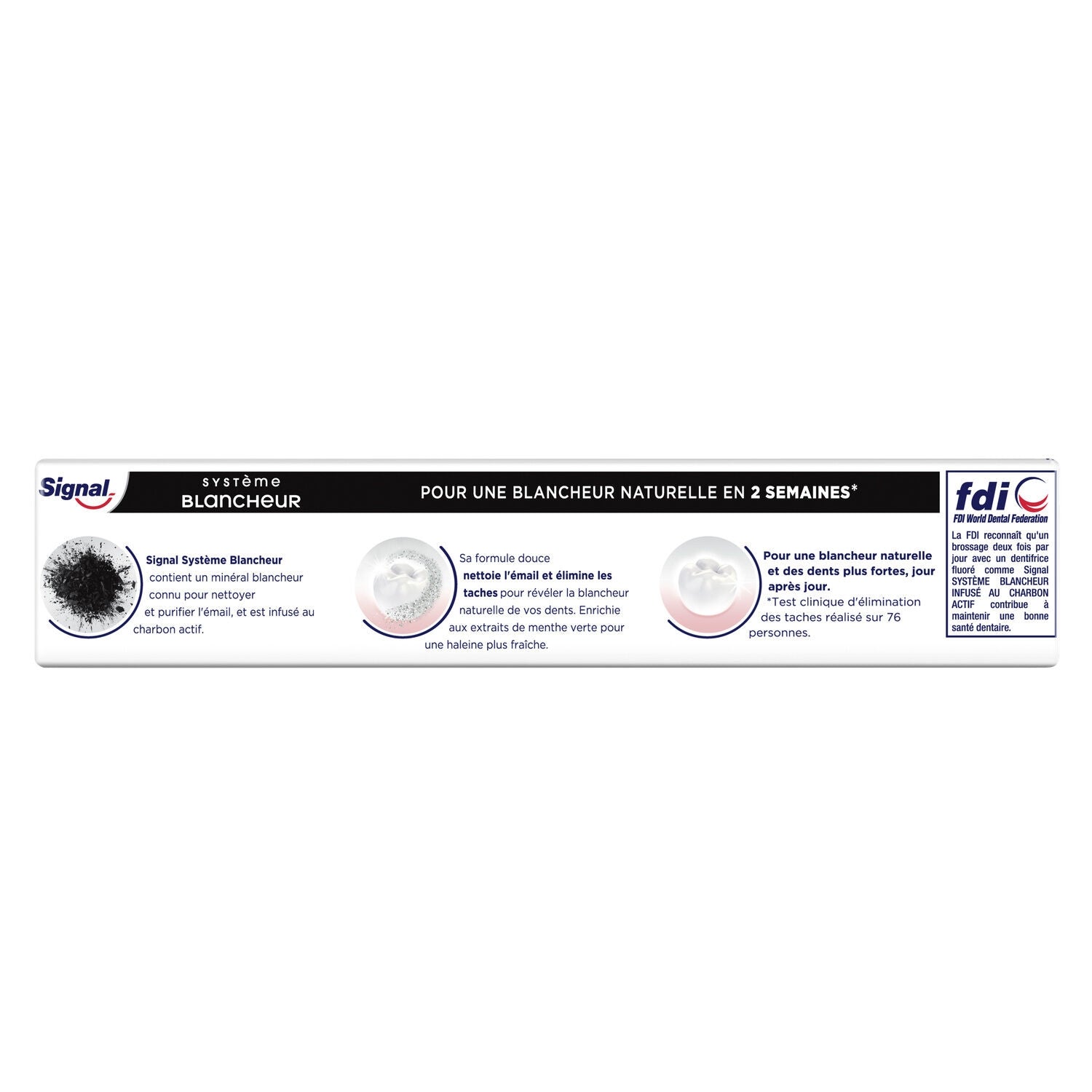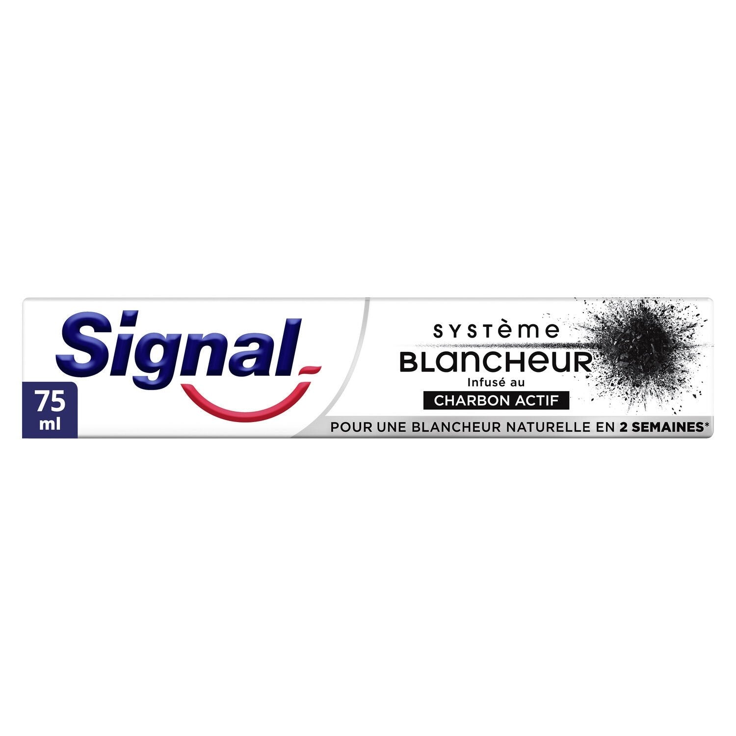 Die Signal Whitening System Zahnpasta garantiert weißere Zähne in nur 2 Wochen*. Sie lässt Ihr Lächeln strahlender wirken und stärkt aktiv den Zahnschmelz – für ein gesundes, strahlendes Lächeln Tag für Tag. Diese Whitening-Zahnpasta enthält ein Mineral, das den Zahnschmelz reinigt und klärt, sowie Aktivkohle. Ihre sanfte Formel reinigt den Zahnschmelz und entfernt Verfärbungen, um das natürliche Weiß Ihrer Zähne zum Vorschein zu bringen. Zusätzlich ist sie mit Minzextrakten für einen frischeren Atem angereichert. Diese Whitening-Zahnpasta ist das ideale Produkt für weißere und kräftigere Zähne – Tag für Tag. Signal unterstützt die Franzosen seit 1961 und setzt sich dafür ein, schon in jungen Jahren gute Mundhygienegewohnheiten zu vermitteln. Gute Gewohnheiten sollten sich jeder aneignen, weshalb Signal die Bedeutung des zweimal täglichen Zähneputzens – morgens und abends – betont. Darüber hinaus arbeitet die Marke eng mit zahlreichen Experten zusammen und ist Partner des National College of University Dental Surgeons in Public Health. Tipps für eine gute Mundhygiene: Putzen Sie Ihre Zähne nach jeder Mahlzeit, wechseln Sie Ihre Signal-Zahnbürste alle 2 bis 3 Monate und gehen Sie mindestens zweimal jährlich zum Zahnarzt. Denken Sie auch daran, beim Zähneputzen das Wasser abzustellen. *Klinischer Test zur Fleckenentfernung an 76 Personen.