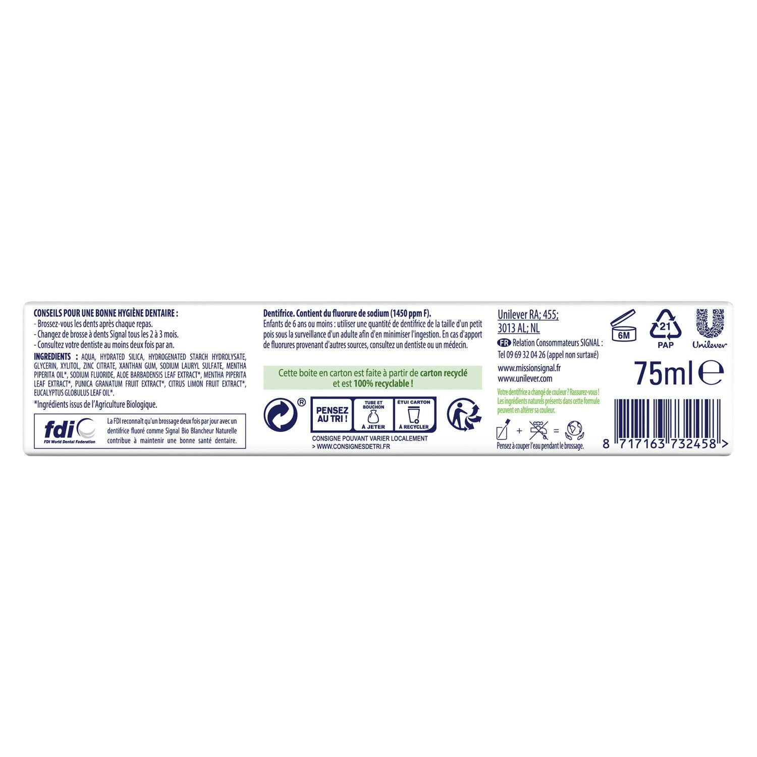 Signals Expertise jetzt in Bio-Form! Die sanfte Formel der Signal Bio Natural Whitening Zahnpasta sorgt für eine effektive Anti-Plaque-Wirkung für natürlich geschützte Zähne und Zahnfleisch. Diese Whitening-Zahnpasta enthält wichtige Inhaltsstoffe für eine gute Mundhygiene: Fluorid zur Stärkung des Zahnschmelzes und zur Vorbeugung von Karies, natürliches Mineral Zink zur Bekämpfung von Plaque und Stärkung des Zahnfleisches sowie natürliche Kieselsäure zur Entfernung oberflächlicher Verfärbungen. Alles 100 % natürlich und konform mit der Cosmébio-Charta! Das Ergebnis: weißere Zähne und ein natürlich geschützter Mund. Wir bei Signal glauben, dass Ihr Lächeln Ausdruck Ihrer Persönlichkeit und Ihres Selbstbewusstseins ist. Unsere Mission: Die Mundgesundheit aller zu verbessern, damit jeder von uns die Kraft seines Lächelns entfalten kann. Signal unterstützt die Franzosen seit 1961, bringt ihnen von klein auf die richtigen Gewohnheiten bei und zeigt ihnen, wie wichtig es ist, zweimal täglich, morgens und abends, die Zähne zu putzen. Wir engagieren uns für den Schutz unseres Planeten und ergreifen Maßnahmen, um die Umweltbelastung unserer Produkte zu begrenzen. In Zusammenarbeit mit TerraCycle® haben wir ein kostenloses Recyclingprogramm gestartet, um Ihren Zahnbürsten und Zahnpastatuben ein zweites Leben zu schenken. Mit Signal zählt jedes Lächeln!