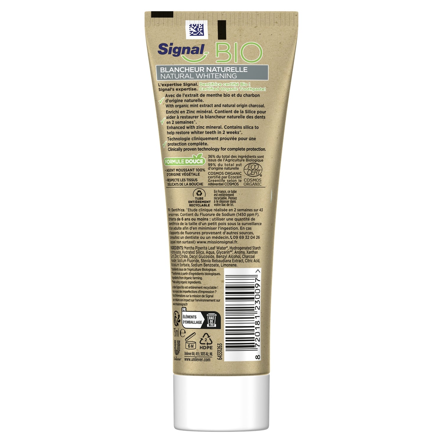 Signal Expertise – zertifizierte Bio-Zahnpasta! Die neue Formel der Signal Bio Natural Whitening Zahnpasta mit Bio-Minzextrakt und natürlicher Aktivkohle ist bio-zertifiziert. Angereichert mit dem Mineral Zink und Kieselsäure hilft sie, das natürliche Weiß der Zähne in 2 Wochen* wiederherzustellen. Diese Whitening-Zahnpasta entspricht der Cosmébio-Charta. Sie enthält außerdem Fluorid, um Ihre Zähne zu stärken und vor Karies zu schützen. Klinisch erprobte Technologie für umfassenden Schutz. Die neue Tube der Signal Natural Whitening Bio-Zahnpasta ist recycelbar und ohne Kartonverpackung – denken Sie an die Sortierung! Für eine gute Mundhygiene: Putzen Sie Ihre Zähne nach jeder Mahlzeit und besuchen Sie mindestens zweimal jährlich Ihren Zahnarzt. Entdecken Sie in derselben Produktreihe auch die Zahnpasten Signal Bio Natural Freshness und Complete Protection. Wir bei Signal glauben, dass Ihr Lächeln Ausdruck Ihrer Persönlichkeit und Ihres Selbstbewusstseins ist. Unsere Mission: Die Mundgesundheit aller zu verbessern, damit jeder von uns die Kraft seines Lächelns entfalten kann. Signal unterstützt die Franzosen seit 1961, indem es ihnen von klein auf die richtigen Gewohnheiten beibringt und ihnen zeigt, wie wichtig es ist, zweimal täglich, morgens und abends, die Zähne zu putzen. Im Interesse des Umweltschutzes ergreifen wir Maßnahmen, um die Umweltbelastung unserer Produkte zu begrenzen. In Zusammenarbeit mit TerraCycle® haben wir ein kostenloses Recyclingprogramm gestartet, um Ihren Zahnbürsten und Zahnpastatuben, die noch nicht über das nationale Sortiersystem recycelt werden können, ein zweites Leben zu schenken. Mit Signal zählt jedes Lächeln! *Klinische Studie über 2 Wochen mit 43 Personen.