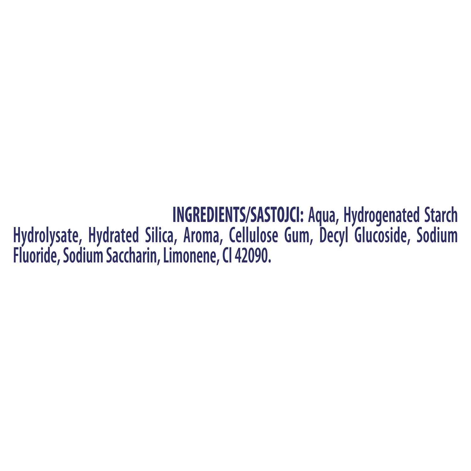 Inhaltsstoffe: Aqua, hydriertes Stärkehydrolysat, hydratisierte Kieselsäure, Aroma, Cellulosegummi, Decylglucosid, Natriumfluorid, Natriumsaccharin, Limonen, CI 42090.