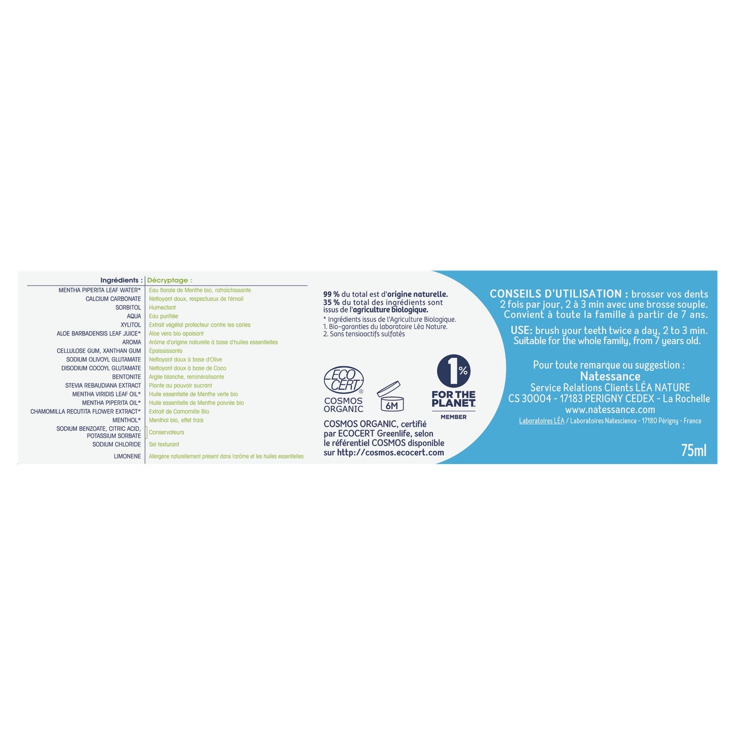 Inhaltsstoffe: MENTHA PIPERITA LEAF WATER*: Bio-Minzblütenwasser: erfrischend CALCIUM CARBONATE: Sanftes, zahnschmelzschonendes Reinigungsmittel SORBITOL: Feuchthaltemittel XYLITOL: Pflanzenextrakt zum Schutz vor Karies NATRIUM OLIVOYL GLUTAMATE Sanftes Reinigungsmittel auf Olivenbasis DISODIUM COCOYL GLUTAMATE Sanftes Reinigungsmittel auf Kokosnussbasis ALOE BARBADENSIS LEAF JUICE* Beruhigende Bio-Aloe Vera AROMA Natürlich gewonnenes Aroma auf Basis von ätherischen Bio-Ölen CELLULOSE GUM, XANTHAN GUM Verdickungsmittel AQUA: gereinigtes Wasser CHAMOMILLA RECUTITA WATER BENTONITE Weiße Tonerde: remineralisierend STEVIA REBAUDIANA EXTRACT Pflanze mit süßender Wirkung MENTHA VIRIDIS LEAF OIL*: ätherisches Bio-Pfefferminzöl MENTHA PIPERITA OIL*: ätherisches Bio-Spearmintöl MENTHOL*: Bio-Menthol, Frischeeffekt NATRIUM BENZOAT, ZITRONENSÄURE, KALIUMSORBAT: Konservierungsmittel LIMONEN. Natürlich im Aroma und in den ätherischen Ölen vorhandenes Allergen.