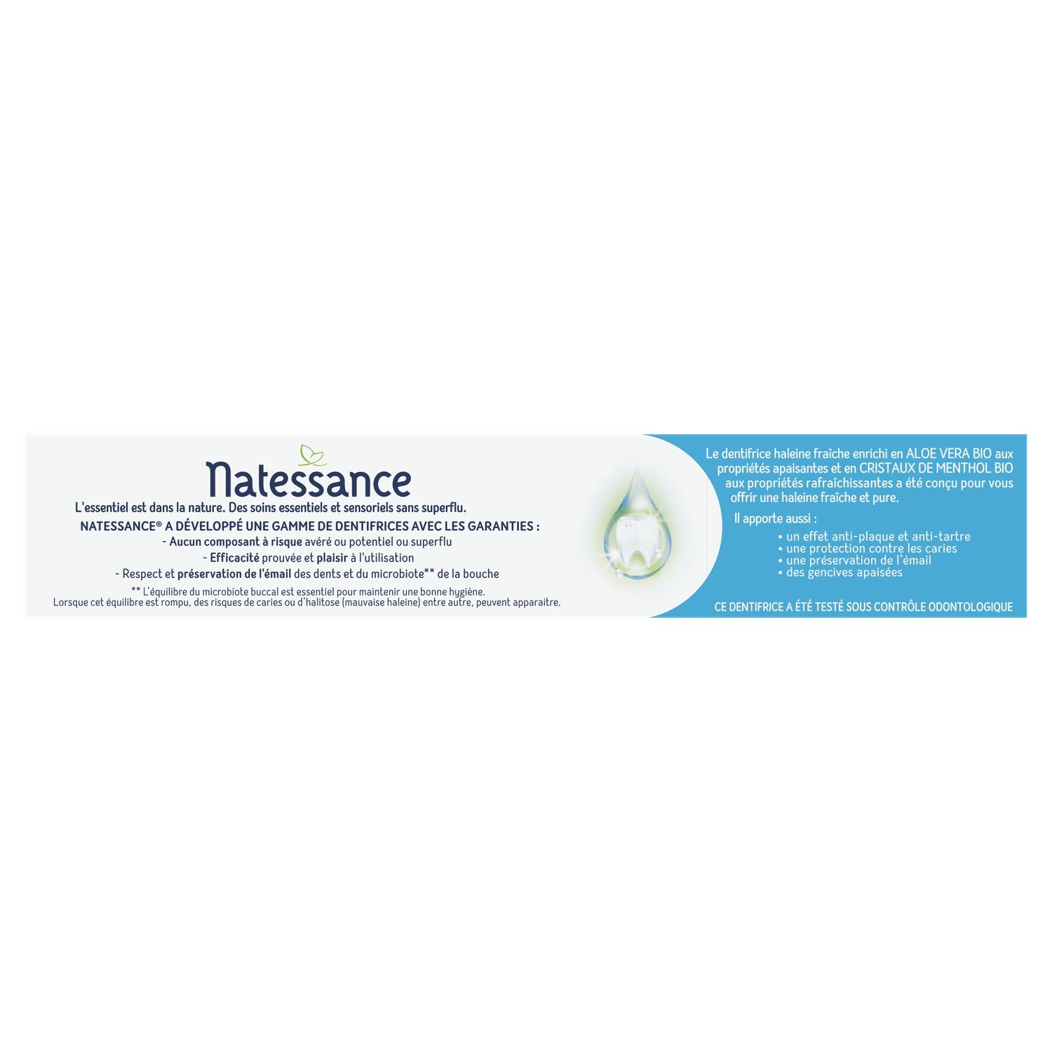 Natessance, weil das Wesentliche in der Natur liegt. Natessance hat eine Reihe von Zahnpasten mit folgenden Garantien entwickelt: – keine nachweislich oder potenziell riskanten oder überflüssigen Bestandteile – Nachgewiesene Wirksamkeit und angenehme Anwendung – Respekt und Erhaltung des Zahnschmelzes und der Mikrobiota** des Mundes **Das Gleichgewicht der oralen Mikrobiota ist für die Aufrechterhaltung einer guten Mundhygiene von entscheidender Bedeutung.