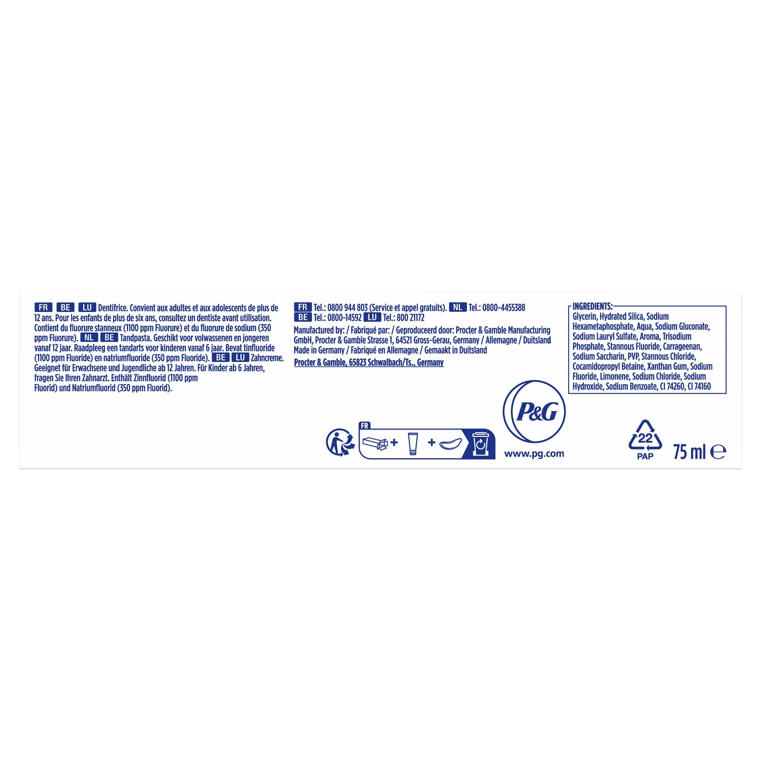 Glycerin, hydratisierte Kieselsäure, Natriumhexametaphosphat, Aqua, Natriumgluconat, Natriumlaurylsulfat, Aroma, Trinatriumphosphat, Zinnfluorid, Carrageen, Natriumsaccharin, PVP, Zinnchlorid, Cocamidopropylbetain, Xanthangummi, Natriumfluorid, Limonen, Natriumchlorid, Natriumhydroxid, Natriumbenzoat, CI 74260, CI 74160
