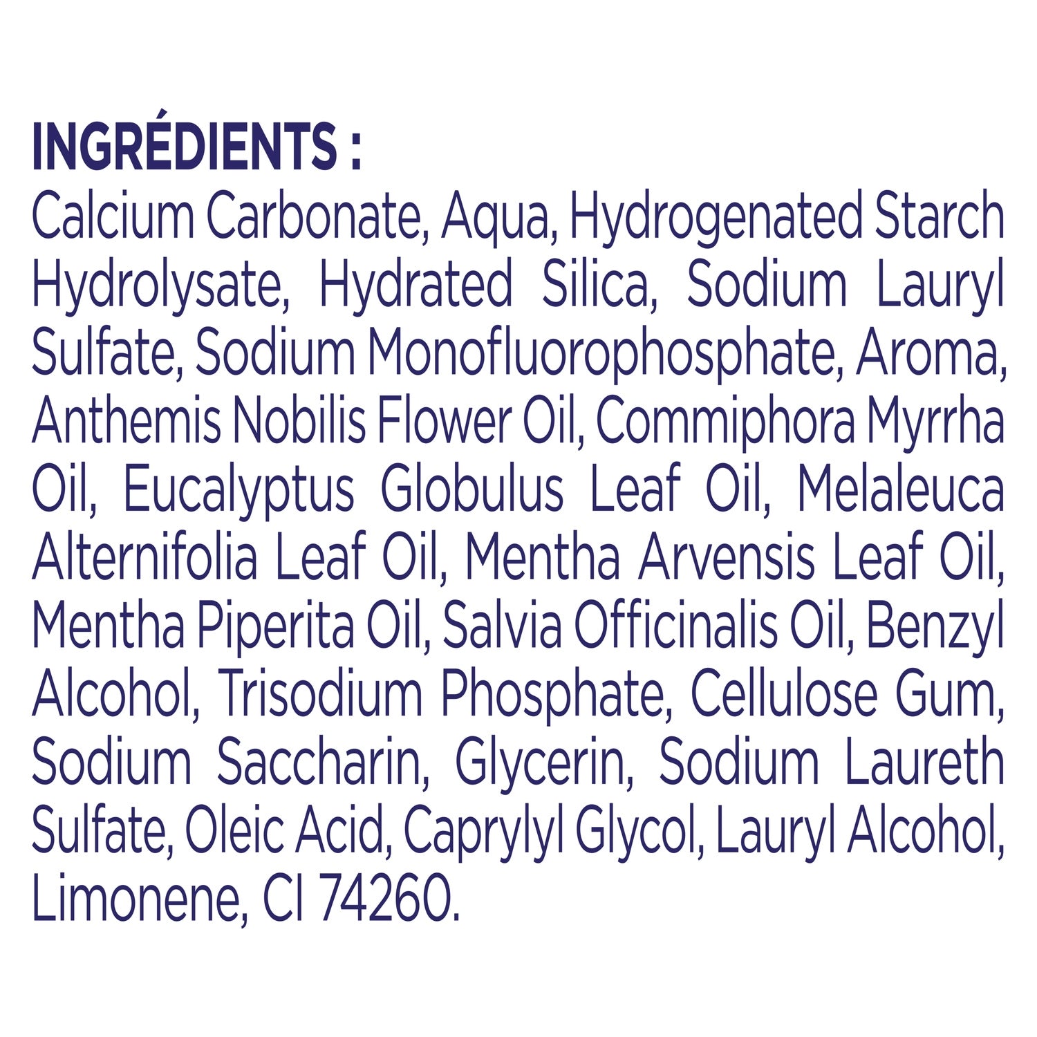 Inhaltsstoffe: Aqua, Calciumcarbonat, hydratisierte Kieselsäure, hydriertes Stärkehydrolysat, Natriumlaurylsulfat, Natriummonofluorphosphat, Kaliumcitrat, Aroma, Cellulosegummi, Benzylalkohol, Trinatriumphosphat, Natriumsaccharin, Eukalyptus-Globulus-Blattöl, Mentha-Arvensis-Blattöl, Mentha-Piperita-Öl, Salvia-Officinalis-Öl, Anthemis-Nobilis-Blütenöl, Commiphora-Myrrha-Harzextrakt, Melaleuca-Alternifolia-Blattöl, Limonen, CI 42051, CI 47005.