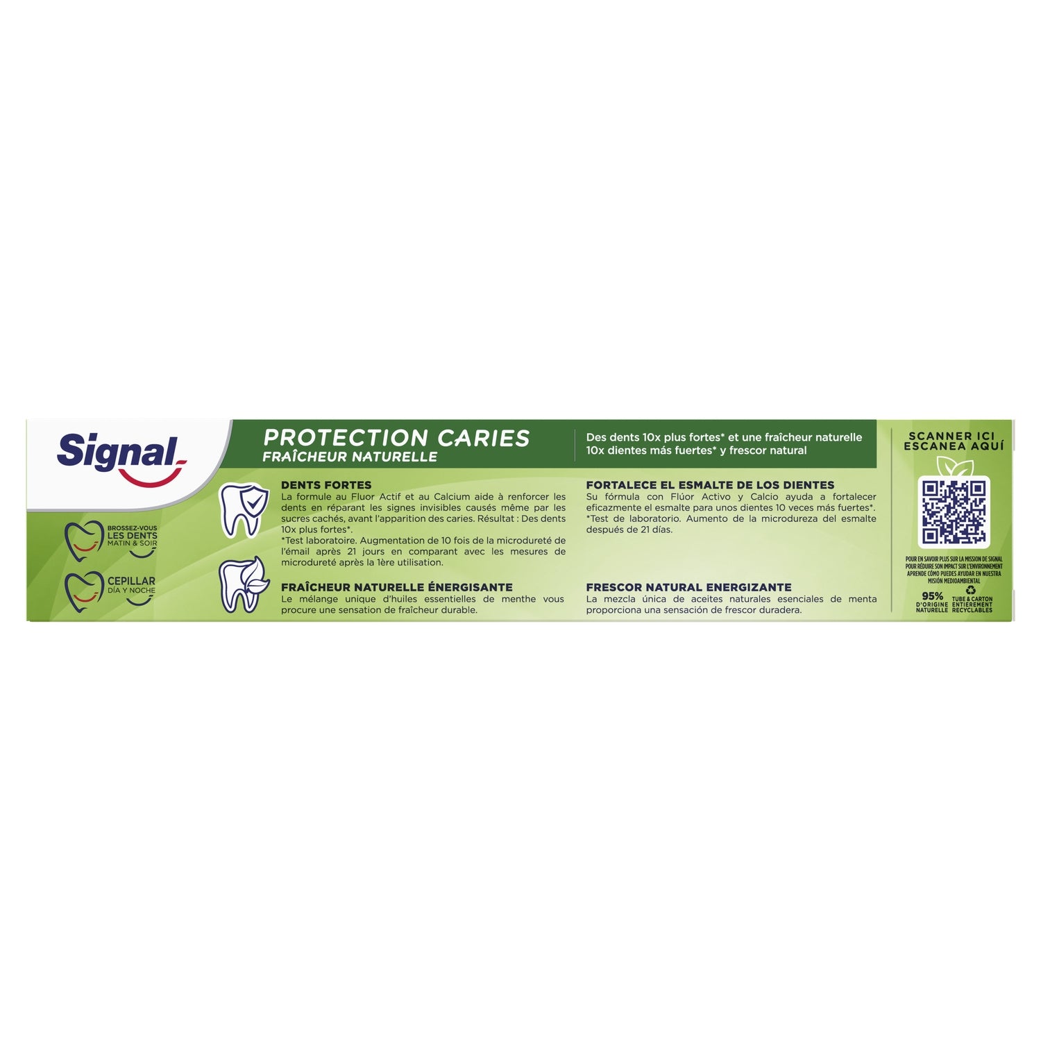 Die Signal Cavity Protection Zahnpasta hilft, die ersten unsichtbaren Anzeichen von Karies zu reparieren und sorgt für frischen Atem.,Verleihen Sie Ihrem Lächeln mit der Doppelwirkung dieser Signal Zahnpasta neues Leben: Kariesschutz und natürliche Frische.,Diese Zahnpasta enthält eine einzigartige Mischung aus natürlichen Minze-Essenzen und schenkt Ihnen einen langanhaltenden Frischekick.,Ihre Formel mit aktivem Fluorid und Kalzium aus 95 % natürlichen Inhaltsstoffen sorgt für 10x stärkere Zähne*.,Tipps für eine gute Mundhygiene: Putzen Sie Ihre Zähne nach jeder Mahlzeit, wechseln Sie Ihre Signal Zahnbürste alle 2 bis 3 Monate und besuchen Sie Ihren Zahnarzt mindestens zweimal im Jahr.,Die Tube dieser Zahnpasta ist jetzt vollständig recycelbar.