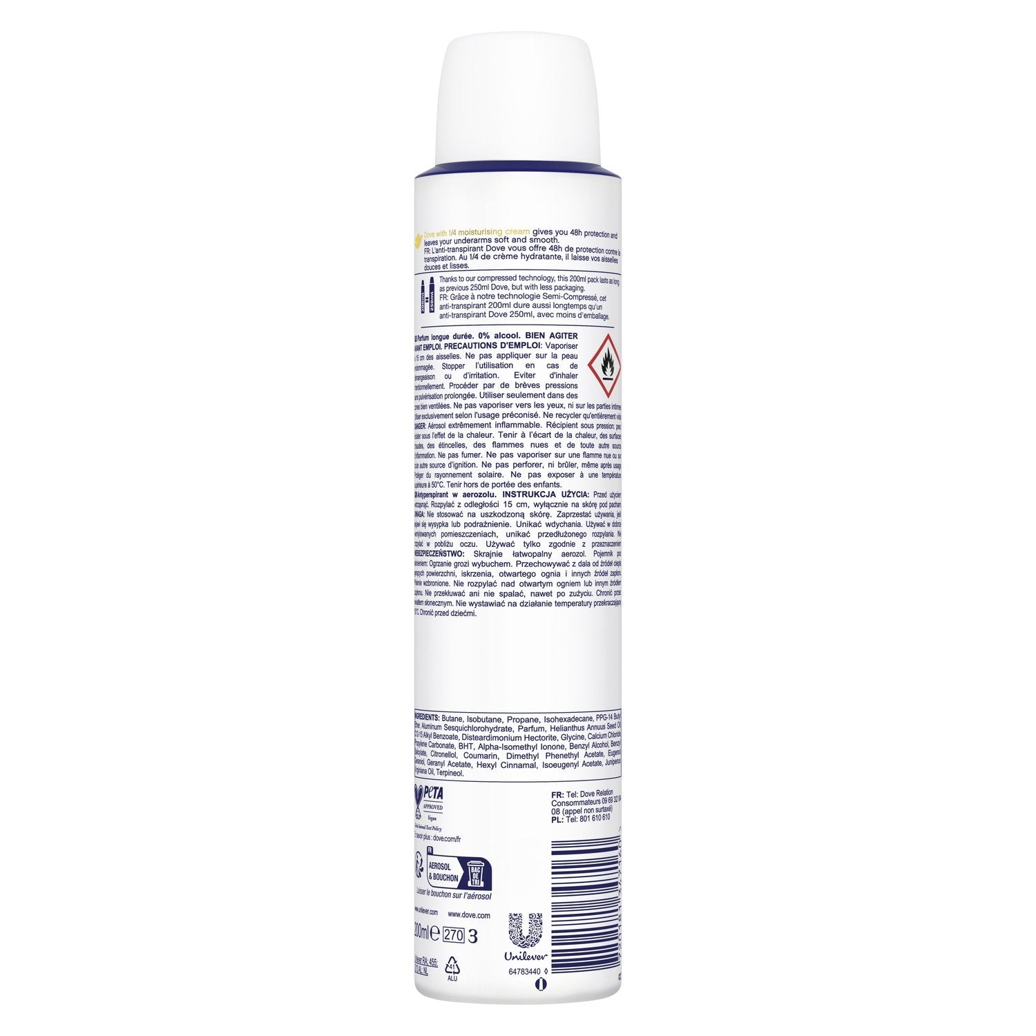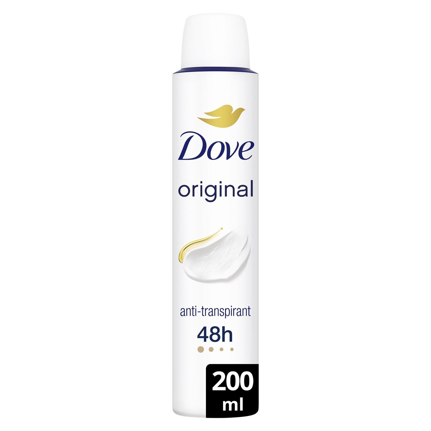 Dove Original Antitranspirant Spray Deodorant pflegt Ihre Achseln jeden Tag.,Dove Original bekämpft wirksam schlechte Gerüche und schützt Sie 48 Stunden lang vor Schweiß.,Die einzigartige Formel dieses Antitranspirant-Deodorants enthält ¼ Feuchtigkeitscreme.,Dieses Antitranspirant-Deodorant macht Ihre Achseln weich und geschmeidig.,Beginnen Sie Ihren Tag voller Zuversicht mit dem ikonischen pudrigen und bernsteinfarbenen Duft von Dove Original!,Das halbkomprimierte 200-ml-Format dieses Damen-Deodorants bietet Ihnen genauso viele Anwendungsmöglichkeiten wie ein Dove Antitranspirant im 250-ml-Format.