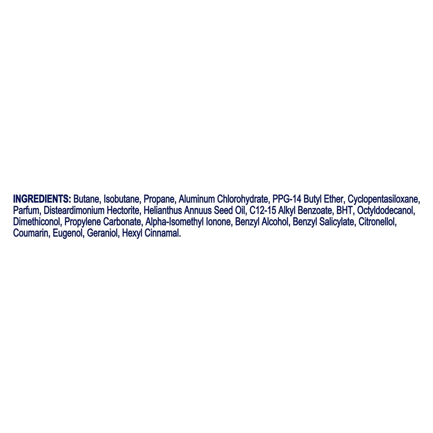 INHALTSSTOFFE: Butan, Isobutan, Propan, Isohexadecan, PPG-14-Butylether, Aluminiumsesquichlorhydrat, Parfum, Helianthus Annuus-Samenöl, Disteardimonium Hectorit, C12-15-Alkylbenzoat, Glycin, Calciumchlorid, Propylencarbonat, BHT, Alpha-Isomethylionon, Benzylalkohol, Benzylsalicylat, Citronellol, Cumarin, Dimethylphenethylacetat, Eugenol, Geraniol, Geranylacetat, Hexylcin…