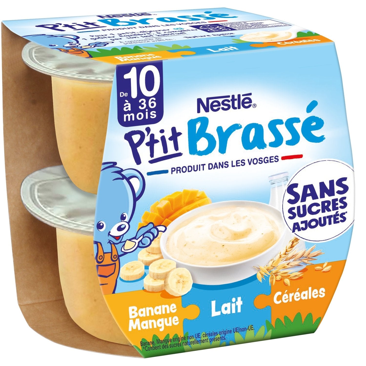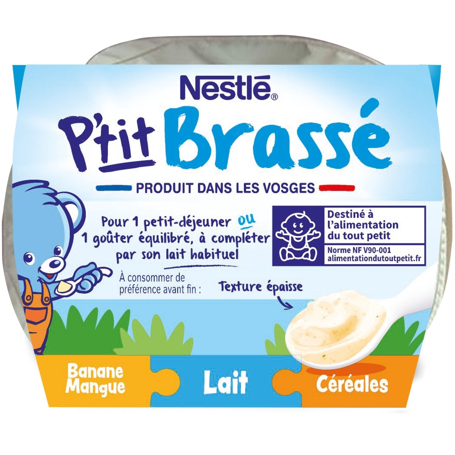 P'tit Brassé Banane-Mango-Müsli, ein ausgewogenes Frühstück oder ein Snack speziell für Babys*, ergänzt durch die gewohnte Milch. Eine Mischung aus Früchten, Milch und Müsli in einer großen Schüssel. Hergestellt in den Vogesen mit französischer Milch! Praktisch und bei Zimmertemperatur lagerbar. *Entspricht den Vorschriften für Babynahrung.
