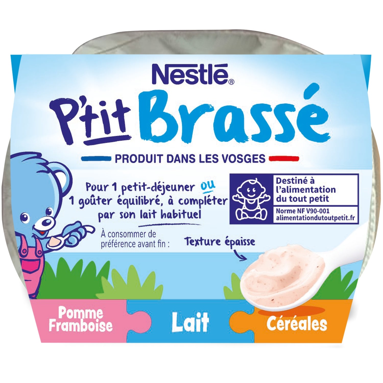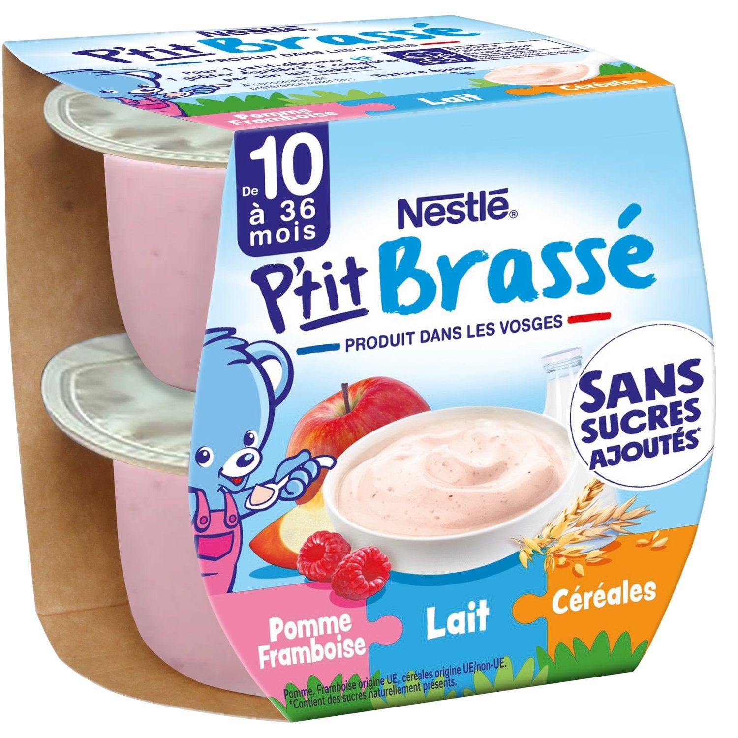 P'tit Brassé Apfel-Himbeer-Müsli, ein ausgewogenes Frühstück oder Snack speziell für Babys*, ergänzt durch die gewohnte Milch. Eine Mischung aus Früchten, Milch und Müsli in einer großen Schüssel. Hergestellt in den Vogesen mit französischer Milch! Praktisch und bei Zimmertemperatur lagerbar. *Entspricht den Vorschriften für Babynahrung.
