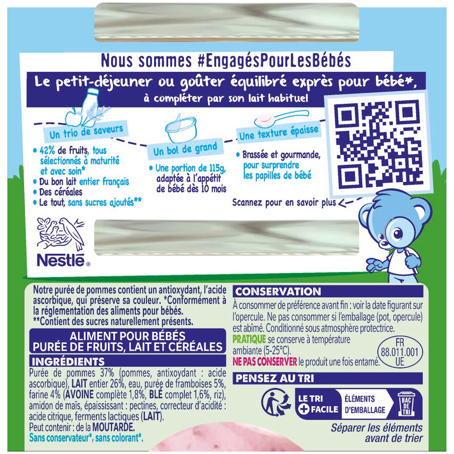 Ohne Zuckerzusatz*,Hergestellt in den Vogesen mit französischer Milch,Eine dicke, gerührte und köstliche Textur, die Babys Geschmacksknospen überrascht,*Enthält von Natur aus Zucker.Früchte aus der EU.