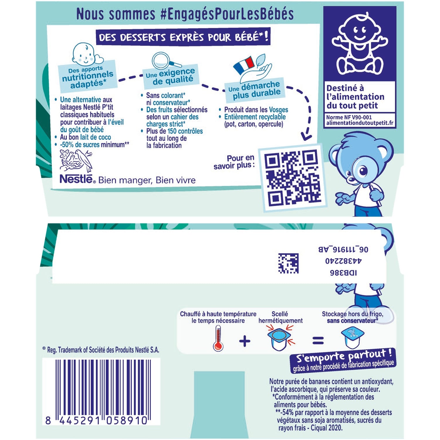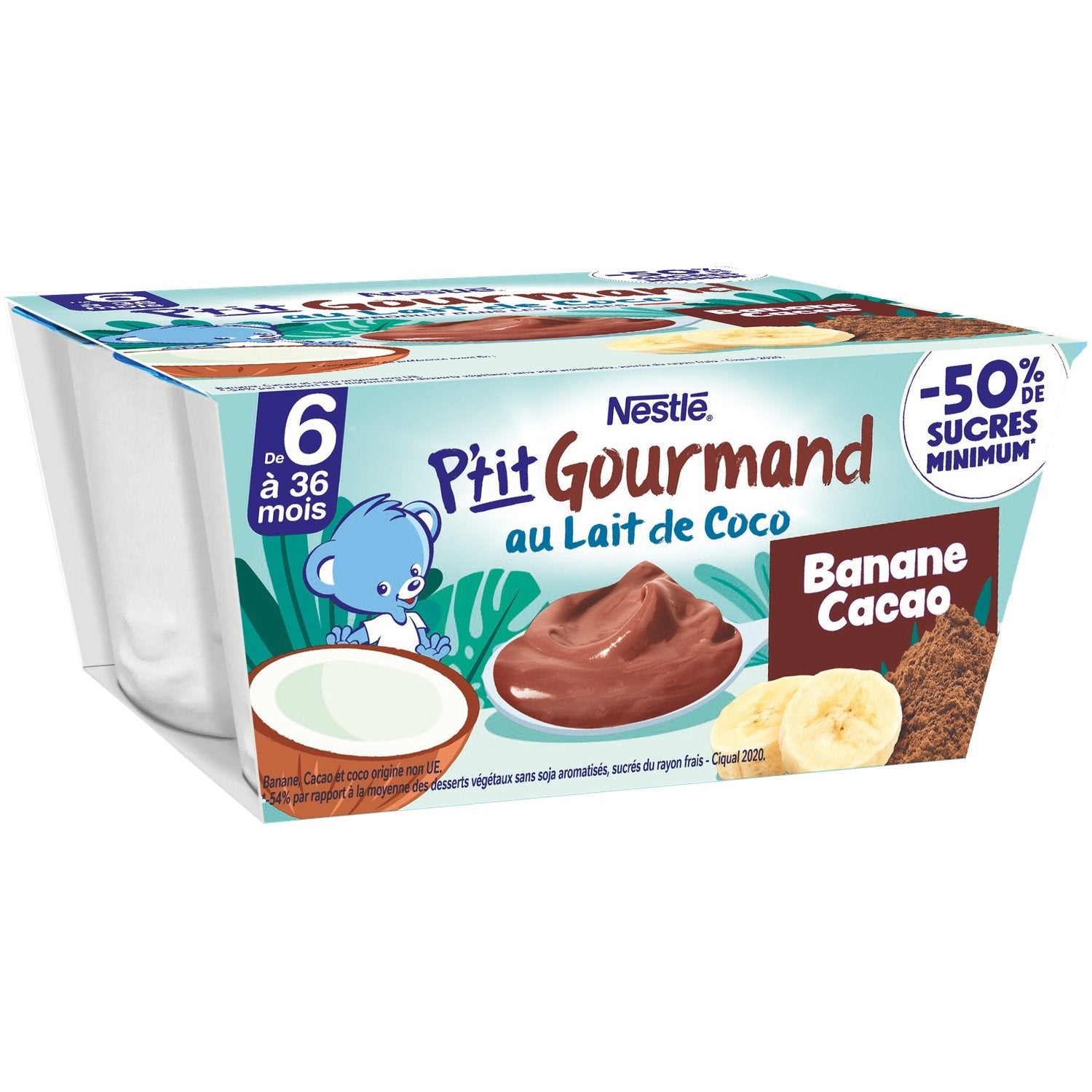 P'tit Gourmand mit Kokosmilch, Banane, Kakao, ein 100 % pflanzliches P'tit Gourmand*, speziell für Babys** entwickelt, mit -54 % Zucker*** und in den Vogesen hergestellt! Praktisch, kann es dank unseres speziellen Herstellungsverfahrens, das die Lagerung außerhalb des Kühlschranks ermöglicht, überallhin mitgenommen werden. *Enthält keine Zutaten tierischen Ursprungs. **Entspricht den Vorschriften für Babynahrung. ***Im Vergleich zum Durchschnitt aromatisierter, gesüßter, sojafreier Desserts auf pflanzlicher Basis in der Frischwarenabteilung – CIQUAL 2020. Banane, Kakao und Kokosnuss aus Nicht-EU-Quellen.