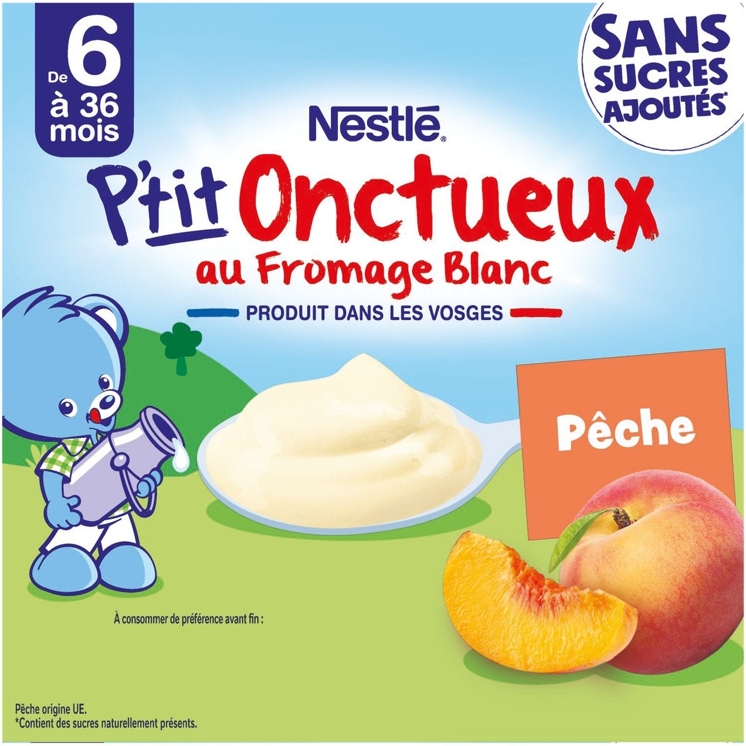 LITTER ONCTUEUX Pfirsich Ohne Zuckerzusatz* mit 3-mal mehr Früchten**. Ein speziell für Babys entwickeltes Milchprodukt***, hergestellt in Arches in den Vogesen mit französischer Milch. Praktisch: Dank unseres speziellen Herstellungsverfahrens kann es überallhin mitgenommen werden und ist auch außerhalb des Kühlschranks lagerfähig. * Enthält von Natur aus Zucker. **Im Vergleich zum durchschnittlichen P'tit Onctueux mit gesüßten Früchten ***Entspricht den Babynahrungsvorschriften. Pfirsich aus der EU