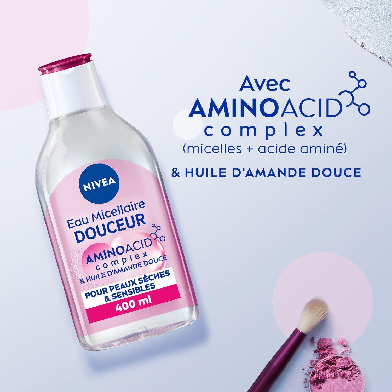 NIVEA Gentle Micellar Water mit seinem Aminosäurekomplex, angereichert mit Mizellen und Aminosäuren, entfernt sanft Make-up und Unreinheiten ohne Reiben oder Abspülen. Dank seiner Formel mit Süßmandelöl wird die Haut mit Feuchtigkeit versorgt und ist weich und geschmeidig. NIVEA Gentle Micellar Water ist für trockene Haut geeignet und ideal für empfindliche Haut. Seine parfümfreie Formel enthält 97 % Inhaltsstoffe natürlichen Ursprungs. Die Flasche besteht zu 97 % aus recyceltem Material (ohne Deckel, Einsatz und Etiketten) und ist zu 100 % recycelbar. Unsere Mizellenwasser sind dermatologisch und augenärztlich getestet. Tränken Sie ein Wattepad und wischen Sie damit über Gesicht, Lippen und Augen, ohne zu reiben. Kein Abspülen erforderlich.
