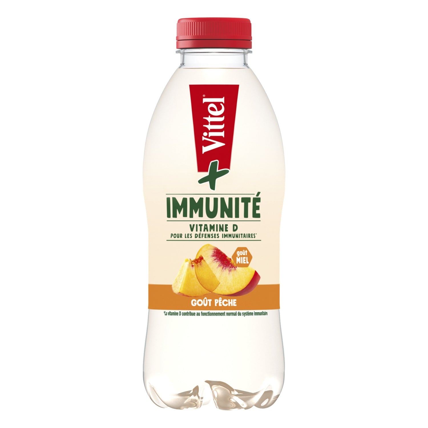 Mehr als nur aromatisiertes Wasser: Vittel+ Immunity mit Zink und Vitamin B6 ist Ihr Verbündeter, um Vitalität zu tanken und Ihre Immunabwehr zu unterstützen**!,Ohne künstliche Aromen (mit natürlichen Aromen), ohne Konservierungsstoffe und kalorienarm.,Flasche aus 100 % recyceltem Material (Flasche ohne Verschluss und Etikett) und recycelbar.,Ein köstlicher Fruchtgeschmack mit einer zarten Honignote.,Im Rahmen einer abwechslungsreichen, ausgewogenen Ernährung und einer gesunden Lebensweise zu konsumieren.