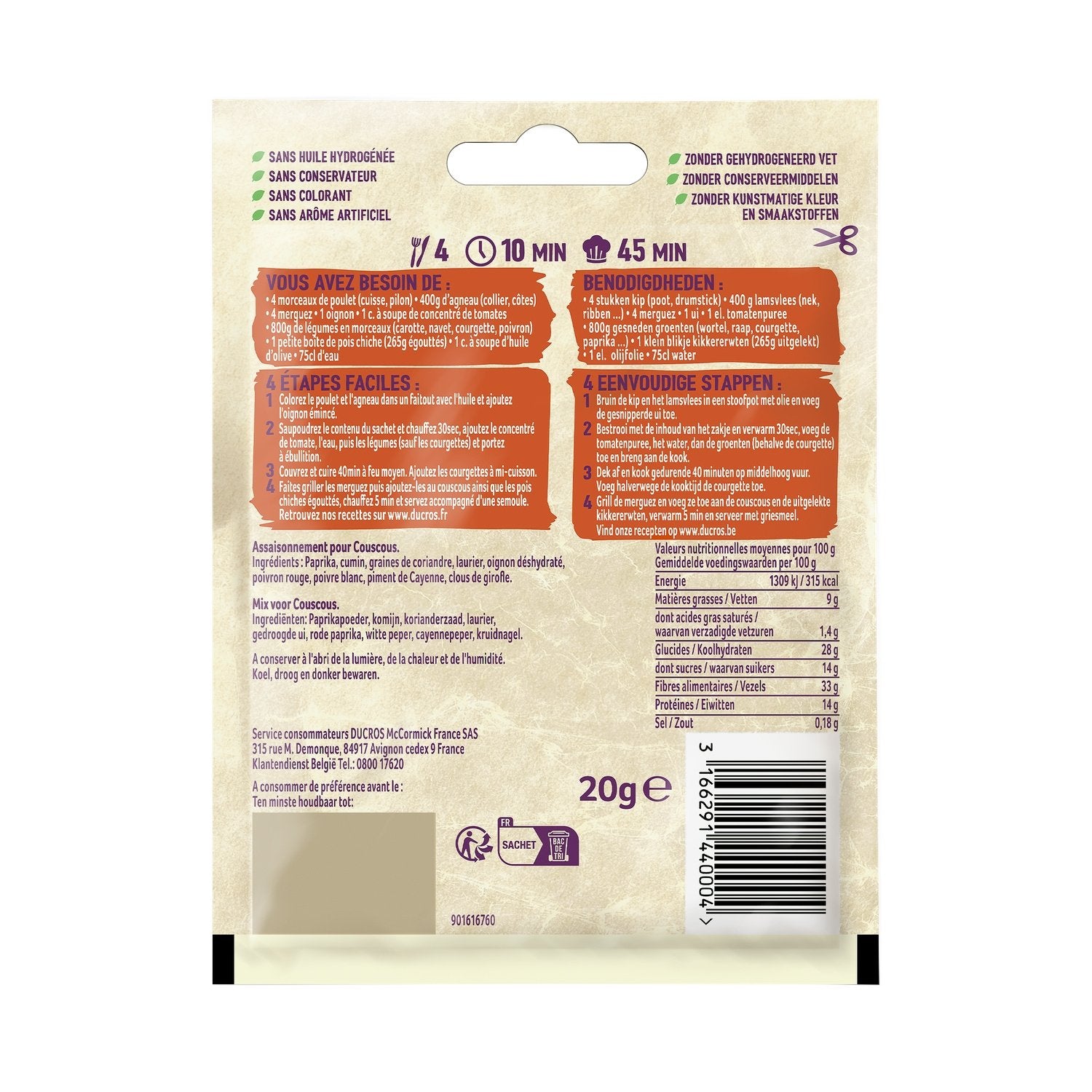 RECYCELBARER BEUTEL*nur gültig in Frankreich OHNE GEHÄRTETES ÖL OHNE KONSERVIERUNGSSTOFFE OHNE FARBSTOFFE OHNE KÜNSTLICHE AROMEN ZUM HINZUFÜGEN VON: ✔ HÜHNCHEN, LAMM, MERGUEZ ✔ ZWIEBELN ✔ KICHERERBSEN ✔ GEMISCHTES GEMÜSE ✔ TOMATENMARK