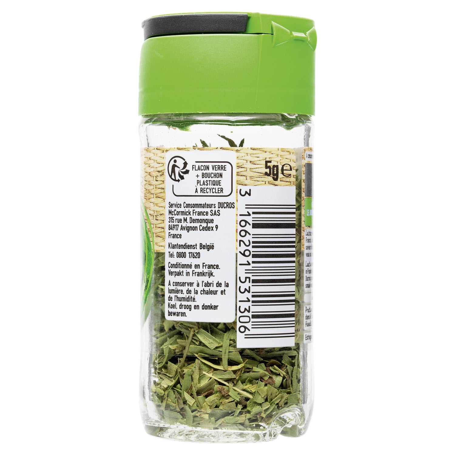 Gönnen Sie sich etwas! Dieser in Frankreich angebaute und geerntete und von Ducros ausgewählte Estragon besticht durch sein feines Aroma und verleiht Ihren Fisch-, Kalbs- oder Geflügelschnitzeln sowie Marinaden eine besondere Note. Am selben Tag geerntet und getrocknet, um Aromen und Geschmack besser zu bewahren.