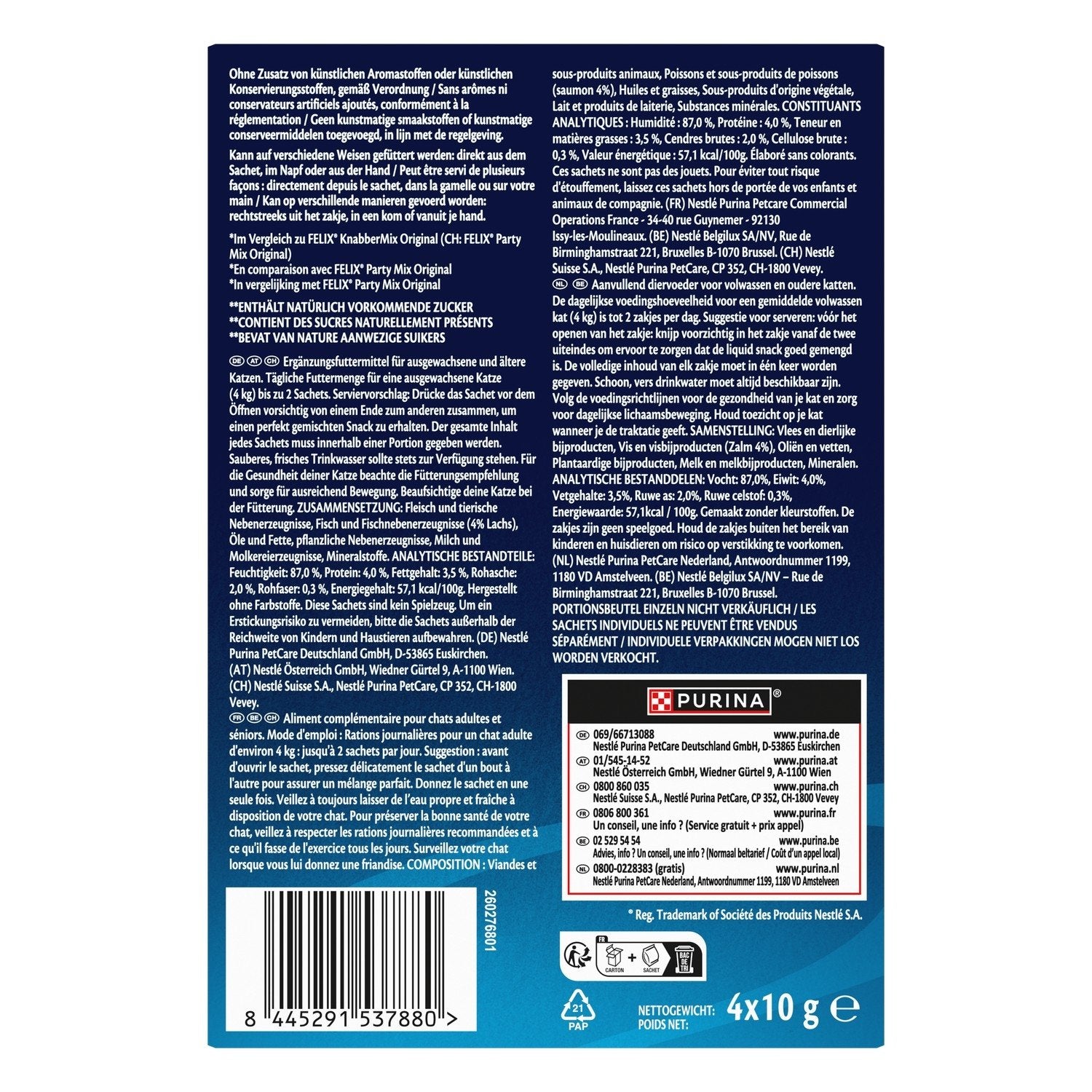 Mit Lachs, Ohne künstliche Farbstoffe hergestellt, Kalorienarm* *Im Vergleich zu Felix® Party Mix Original, Ohne Zuckerzusatz** **Enthält von Natur aus Zucker, Unwiderstehlich schmeckender Katzensnack, Ein Leckerbissen, der Ihrer Katze mit der Hand gegeben werden kann, für Momente der Bindung