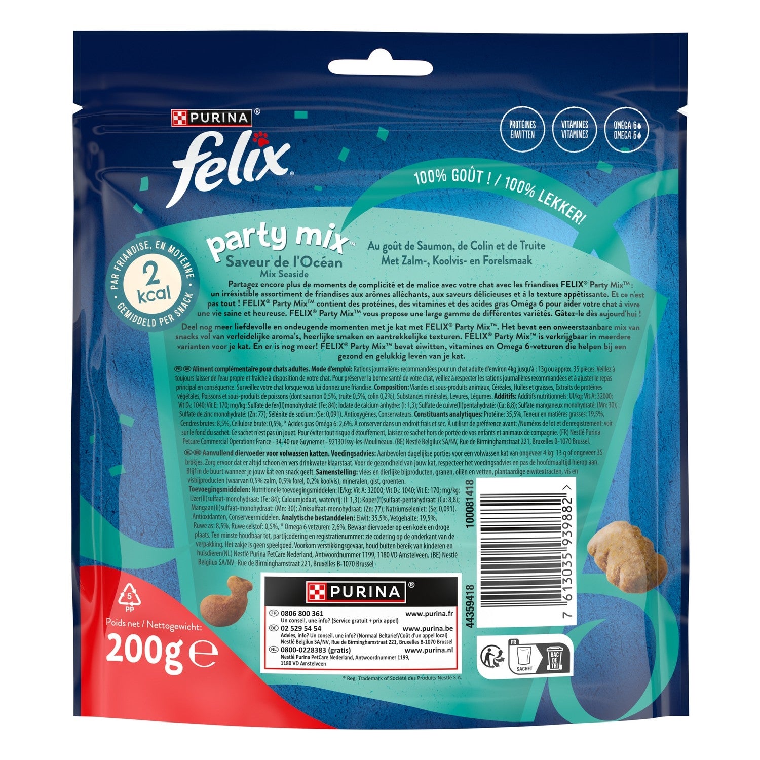 FELIX® Party Mix Ocean Flavor mit Lachs-, Seehecht- und Forellengeschmack: eine unwiderstehliche Auswahl an Leckereien mit verlockenden Aromen, köstlichen Geschmacksrichtungen und appetitanregender Textur.