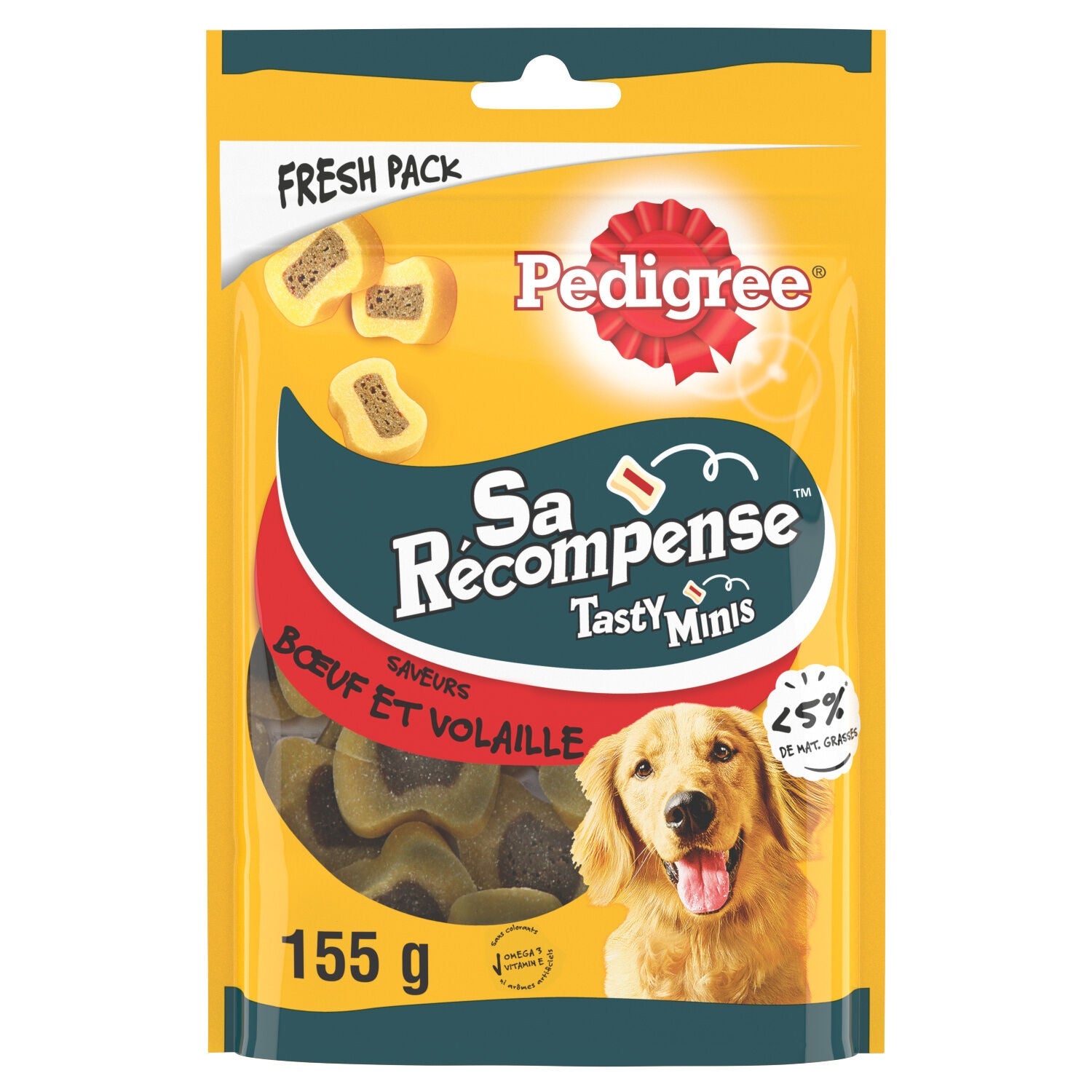 Die leckeren Minis-Hundesnacks mit Rind- und Geflügelgeschmack von PEDIGREE® Sa Récompense™ sind in einem wiederverschließbaren 155-g-Beutel erhältlich.
