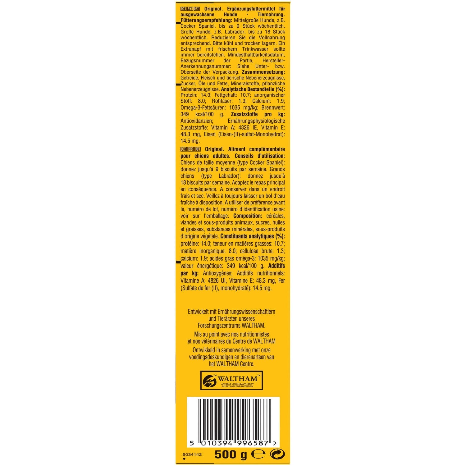 Ergänzungsfuttermittel für erwachsene Hunde. Pedigree® Markies™ Hundekekse sind köstlich gefüllt und richtig knusprig. Die ideale Belohnung für die Spielzeit Ihres Hundes. Ein köstlicher Leckerbissen ohne künstliche Aromen. Mit Omega-3-Fettsäuren, die Ihren Hund ein Leben lang fit halten, Vitaminen zur Unterstützung seiner natürlichen Abwehrkräfte und Mineralstoffen, einschließlich Kalzium, für starke Knochen. Als Besitzer belohnen wir unsere Hunde gerne, weil wir so mit ihnen interagieren und unsere Beziehung zu ihnen pflegen können. Mit Pedigree®-Keksen können Sie sicher sein, dass Sie Ihren Hund richtig trainieren und ihm ganz beruhigt Freude und Wohlbefinden bereiten können. Hundeleckerli, entwickelt in Zusammenarbeit mit unseren Ernährungswissenschaftlern und Tierärzten im WALTHAM® Forschungszentrum – der weltweit führenden Referenz für Tierernährung und -gesundheit.