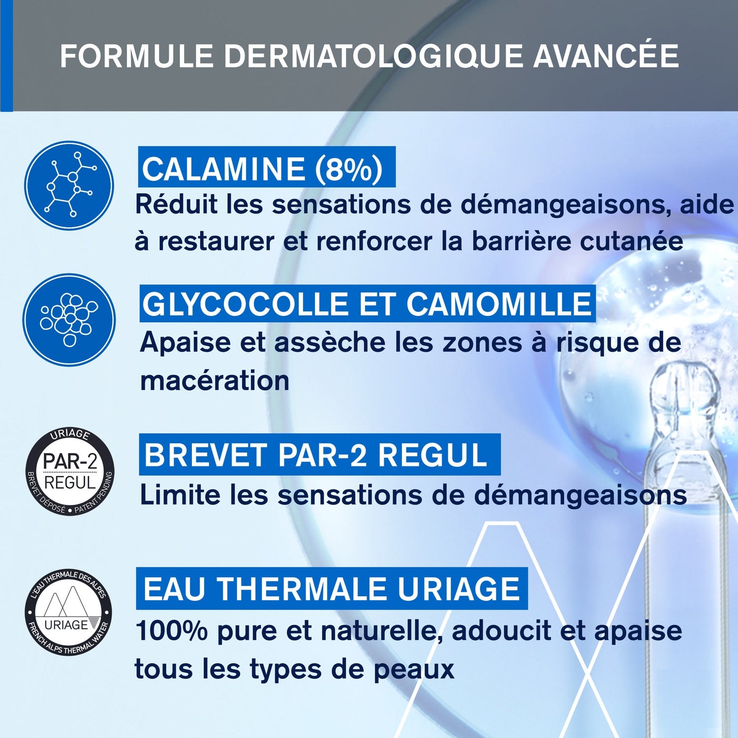 Dieses frische, parfümfreie Gel lindert Juckreiz, Kribbeln und Hautirritationen in behaarten oder mazerationsgefährdeten Bereichen (Hautfalten, Anogenitalbereich). Seine Hochleistungsformel enthält 8 % Galmei, Kamille und Thermalwasser, kombiniert mit dem exklusiven PAR 2-REGUL-Patent von Uriage. Das Gel sollte so oft wie nötig auf die betroffenen Körperstellen (äußerer Intimbereich, behaarte und stärker beanspruchte Hautpartien) aufgetragen werden und wirkt ab der ersten Anwendung. Das dermatologisch getestete Gel ist für Babys, Kinder, Erwachsene und Senioren geeignet.