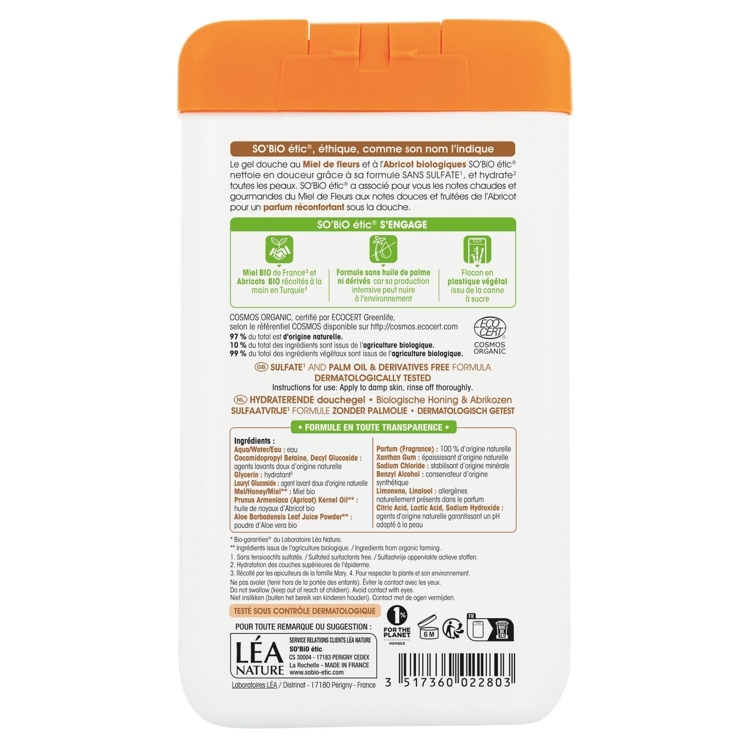 SO'BiO étic® Duschgel mit Bio-Blütenhonig und Aprikose reinigt dank seiner SULFATFREIEN1 Formel sanft und spendet allen Hauttypen Feuchtigkeit2. SO'BiO étic® hat die warmen und köstlichen Noten von Blütenhonig mit den Noten kombiniert