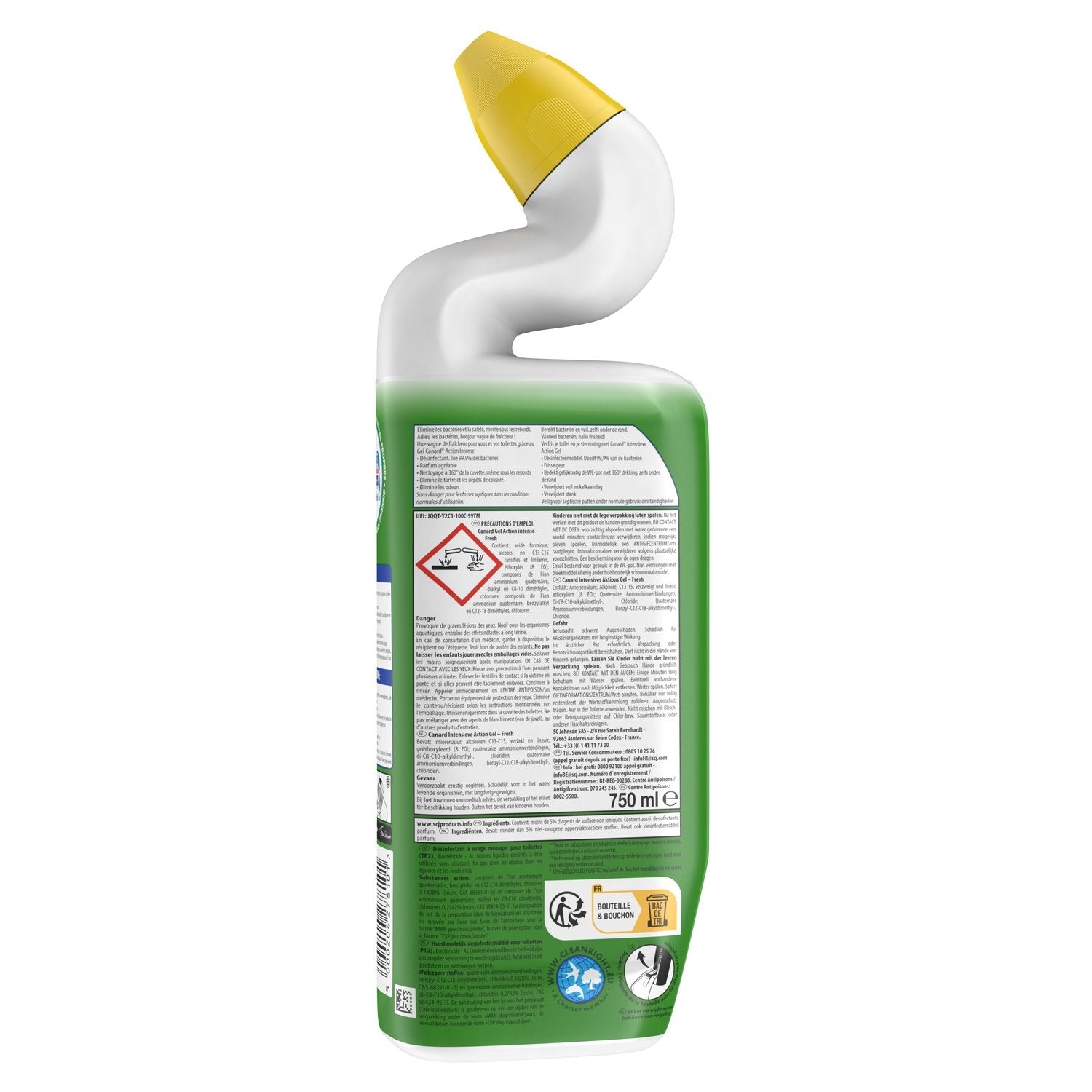 Canard® Gel Action Intense 50 % PCR reinigt schnell und tötet 99,9 % der Bakterien in Ihrer Toilettenschüssel ab. Es entfernt Kalk, Kalkablagerungen und andere Flecken. Das einzigartige Design dieses Toilettenreinigungsgels ermöglicht es Ihnen, unter dem Rand der Schüssel zu reinigen und die Flüssigkeit gleichmäßig auf die Wände aufzutragen, für eine gründliche Reinigung. Der recycelbare Flaschenkörper besteht zu 50 % aus recyceltem Kunststoff. Stellen Sie sicher, dass die Flasche leer ist, und entfernen Sie das Etikett vor dem Recycling* (*Recycling: Bitte suchen Sie Ihr nächstgelegenes Recyclingzentrum). Dieses Toilettenreinigungsgel reinigt und erfrischt Ihre Toilette mühelos, ohne aufdringliche Düfte zu verbreiten.