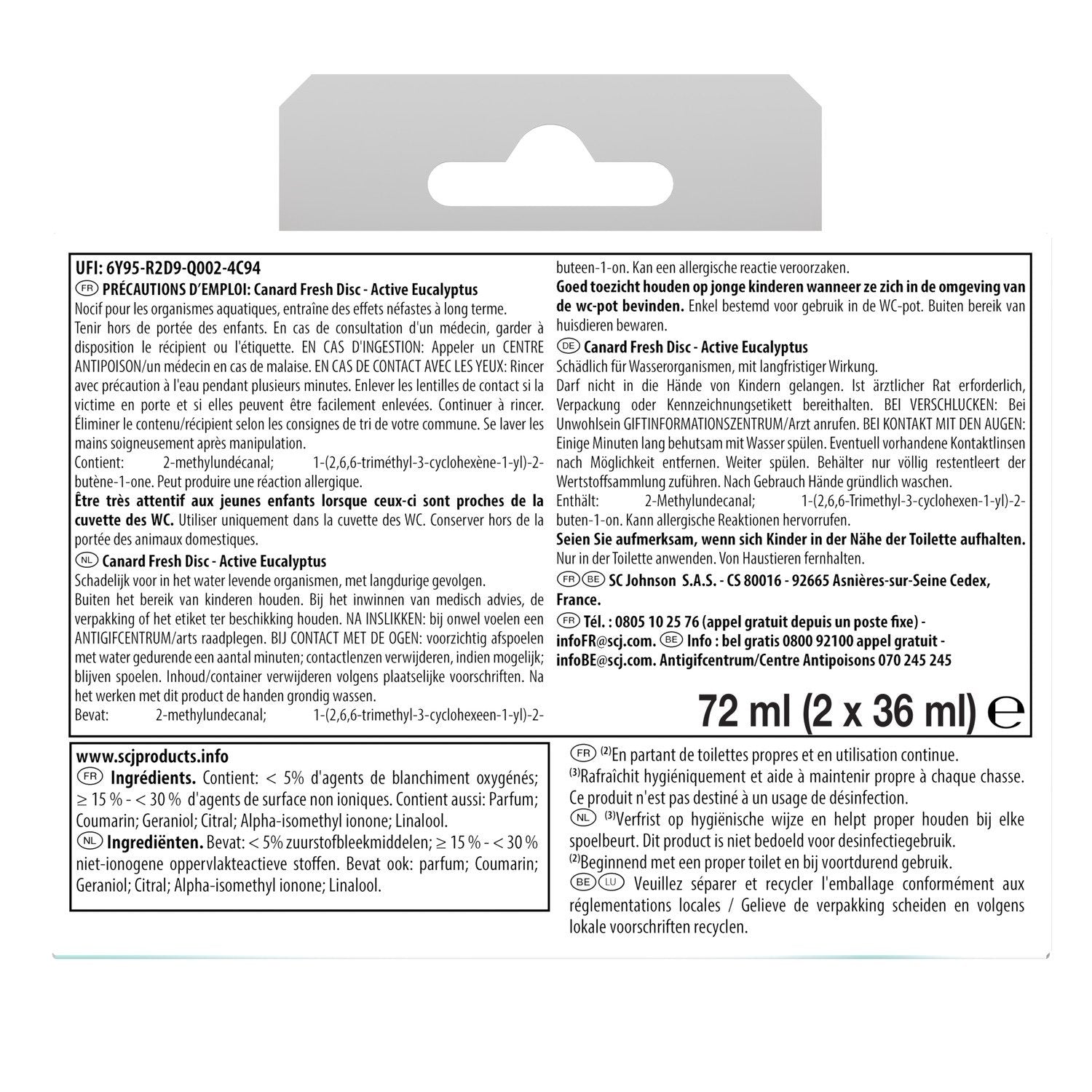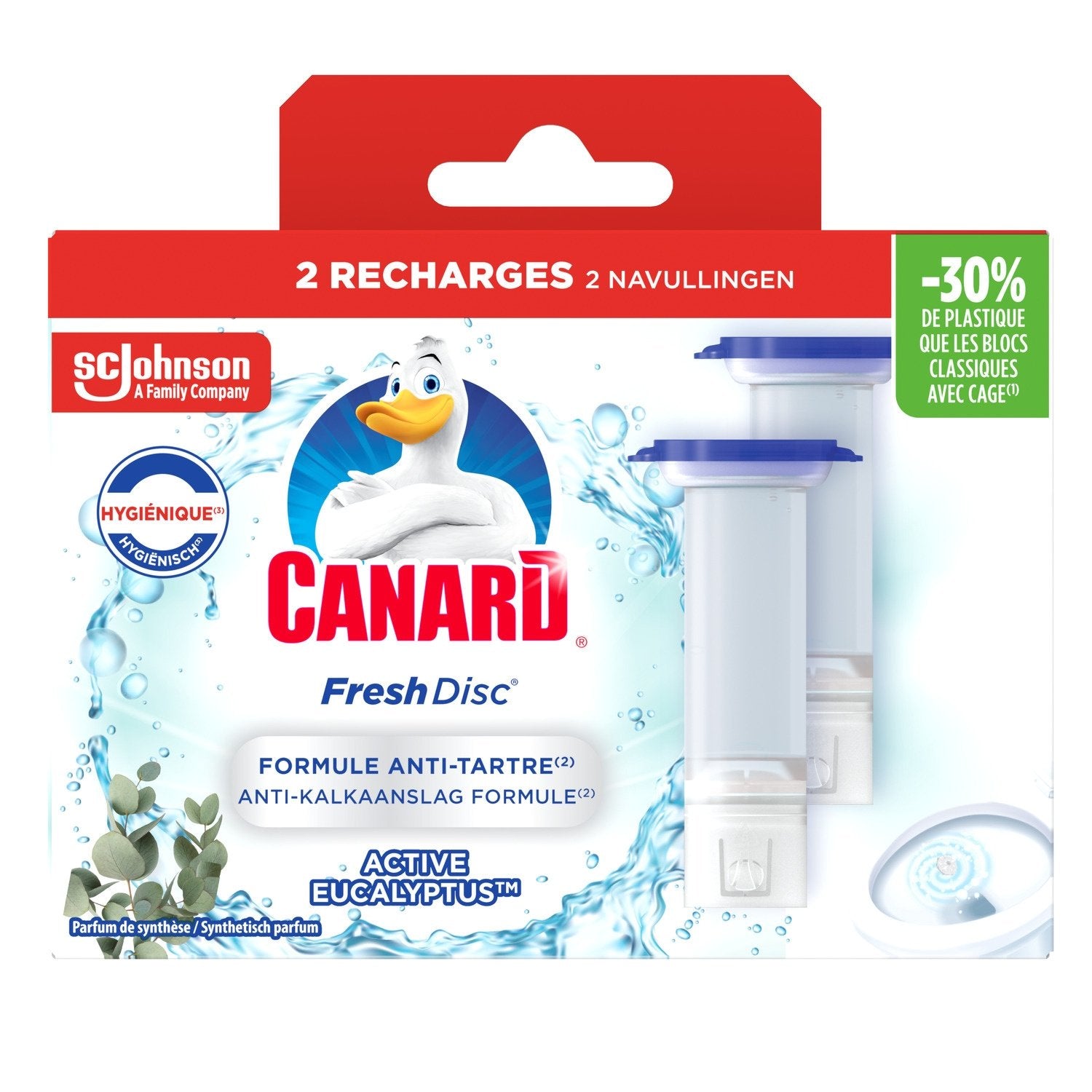 Fresh Disc® – Entdecken Sie Canard® Fresh Disc®, einen käfigfreien Block, der Kalk bekämpft, der Bakterien einschließen kann!,Im Nachfüllformat: eine wirtschaftliche Lösung mit weniger Kunststoff*.,Anti-Kalk-Formel**. Erfrischt hygienisch und hilft, mit jedem Spülen sauber zu bleiben.,Duft: Verströmt kontinuierlich einen aktiven Eukalyptus™-Duft.,Dauer: Eine Nachfüllpackung bietet bis zu 16 Wochen Wirksamkeit! Synthetischer Duft *im Vergleich zum Kauf von 2 Einheiten. 1 doppelte Nachfüllung = -60 % Kunststoff im Vergleich zu 2 Einheiten. **Beginnen Sie mit einer sauberen Toilette und im Dauergebrauch.