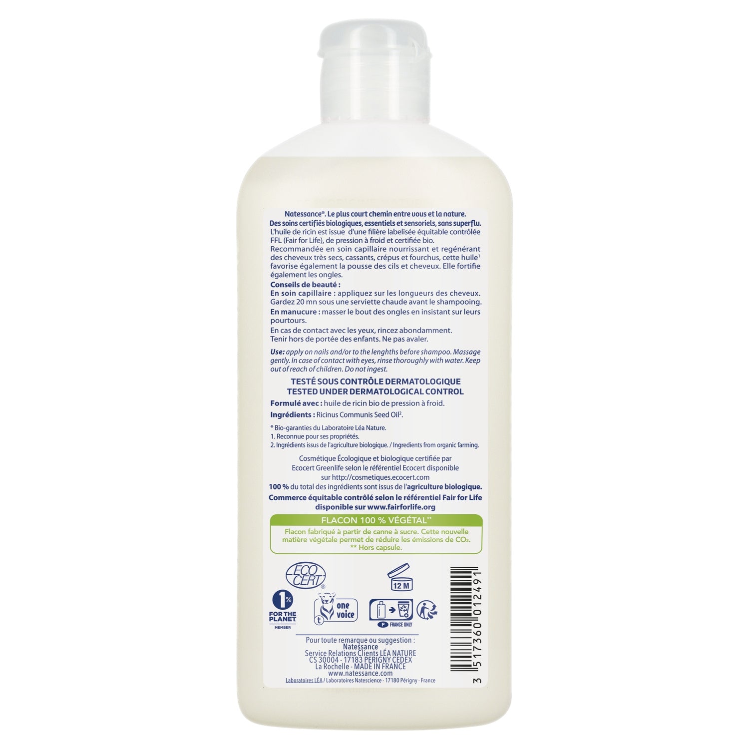RICINUS COMMUNIS (RIZINUSSAMEN)ÖL*Formuliert mit: erstes kaltgepresstes Rizinusöl. 100 % der gesamten Inhaltsstoffe stammen aus biologischem Anbau* Inhaltsstoffe aus biologischem Anbau