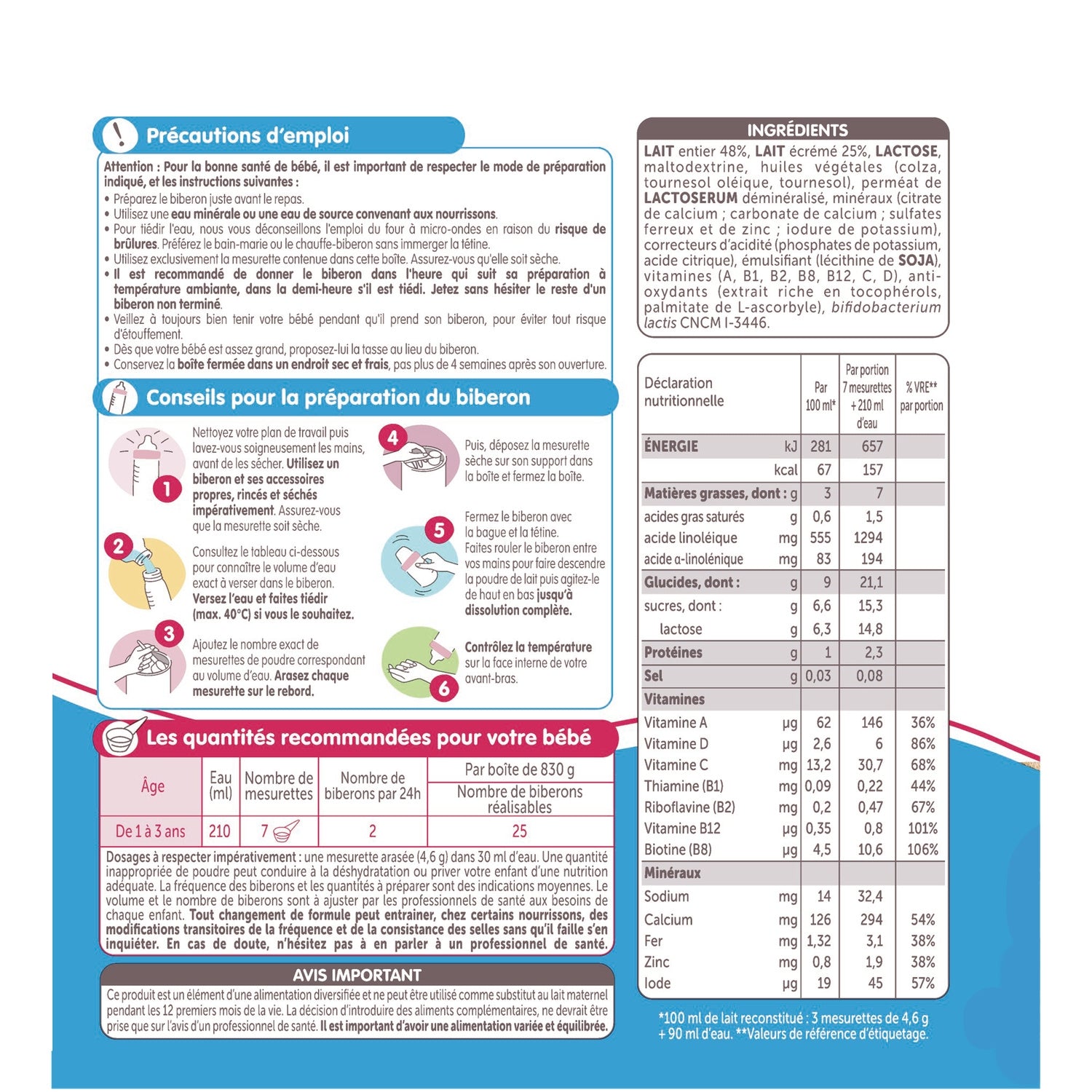 Zutaten: VollMILCH 48 %, MagerMILCH 25 %, LAKTOSE, Maltodextrin, Pflanzenöle (Raps, Sonnenblumenöl, Sonnenblumenöl), demineralisiertes MOLKENPERMEAT, Mineralstoffe (Calciumcitrat, Calciumcarbonat, Eisen- und Zinksulfate, Kaliumiodid), Säureregulatoren (Kaliumphosphate, Zitronensäure), Emulgator (SOJAlecithin), Vitamine (A, B1, B2, B8, B12, C…