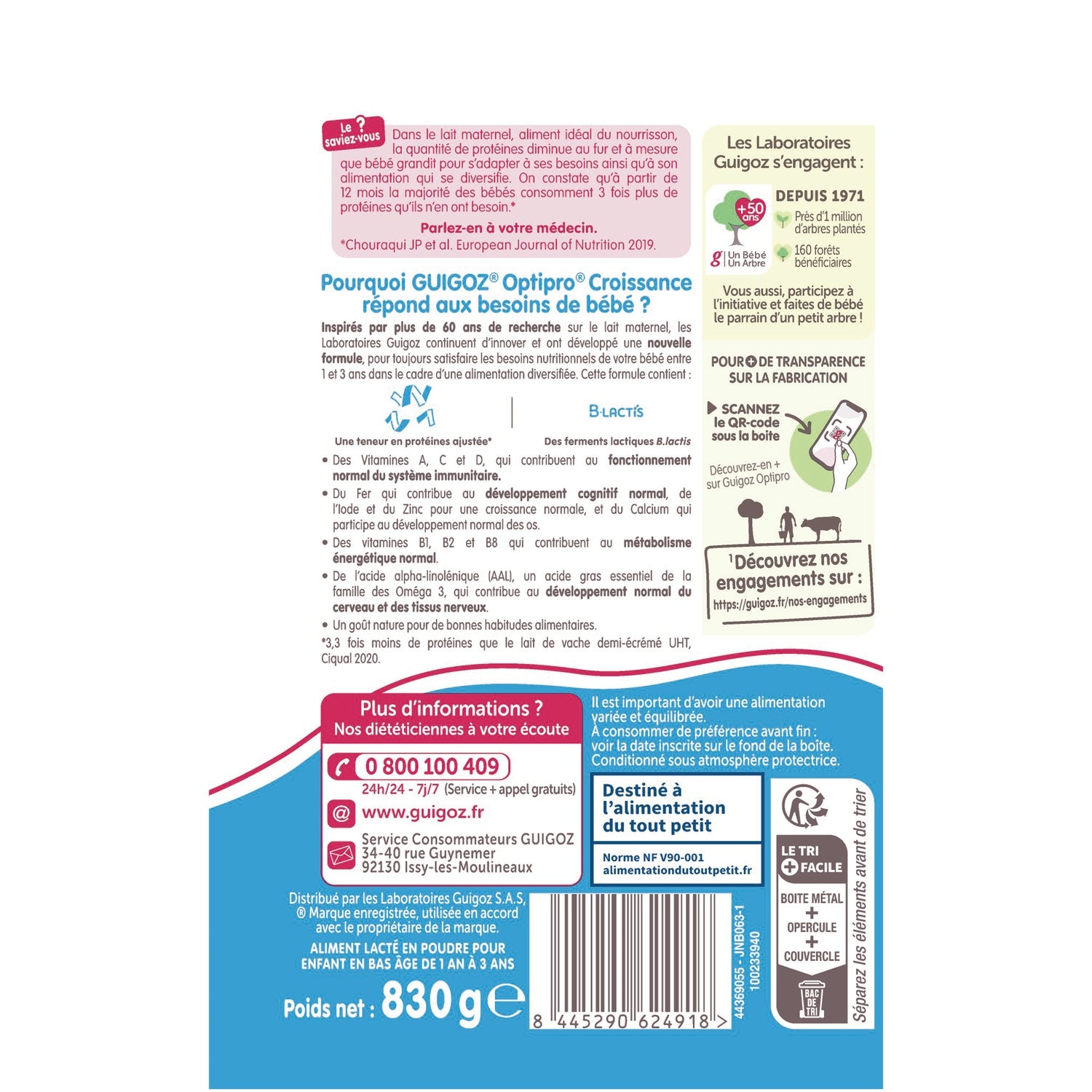 Warum erfüllt GUIGOZ® Optipro® Growth die Bedürfnisse Ihres Babys? Inspiriert durch über 60 Jahre Forschung zur Muttermilch, arbeiten die Guigoz Laboratories weiterhin an Innovationen und haben eine neue Formel entwickelt, um den Nährstoffbedarf Ihres Babys zwischen 1 und 3 Jahren als Teil einer abwechslungsreichen Ernährung stets zu erfüllen. Diese Formel enthält: Angepassten Proteingehalt*. B.Lactis-Milchsäurefermente. Vitamine A, C und D, die zu einer normalen Funktion des Immunsystems beitragen. Eisen, das zu einer normalen kognitiven Entwicklung beiträgt, Jod und Zink für ein normales Wachstum und Kalzium, das zu einer normalen Knochenentwicklung beiträgt. Vitamine B1, B2 und B8, die zu einem normalen Energiestoffwechsel beitragen. Alpha-Linolensäure (ALA), eine essentielle Fettsäure aus der Omega-3-Familie, die zur normalen Entwicklung des Gehirns und des Nervengewebes beiträgt. Natürlicher Geschmack für gute Essgewohnheiten. *3,3-mal weniger Protein als UHT-teilentrahmte Kuhmilch, Ciqual 2020. Hergestellt in Frankreich / mit französischer Milch / ohne Palmöl.