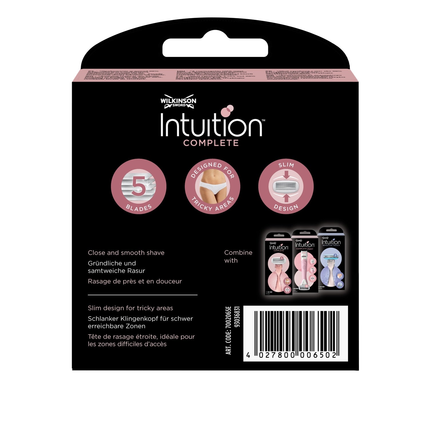 Intuition Complete mit seinen 5 Skin-Perfect-Klingen sorgt für eine besonders gründliche und sanfte Rasur. Dank des schmalen Rasierkopfes ist er auch für schwer erreichbare Stellen ideal. Skin-Protect-Gel befeuchtet die Haut, erleichtert das Gleiten und lindert Hautirritationen. Intuition Complete Rasierer können mit den Klingen-Nachfüllpackungen Intuition Complete und Intuition FAB kombiniert werden.