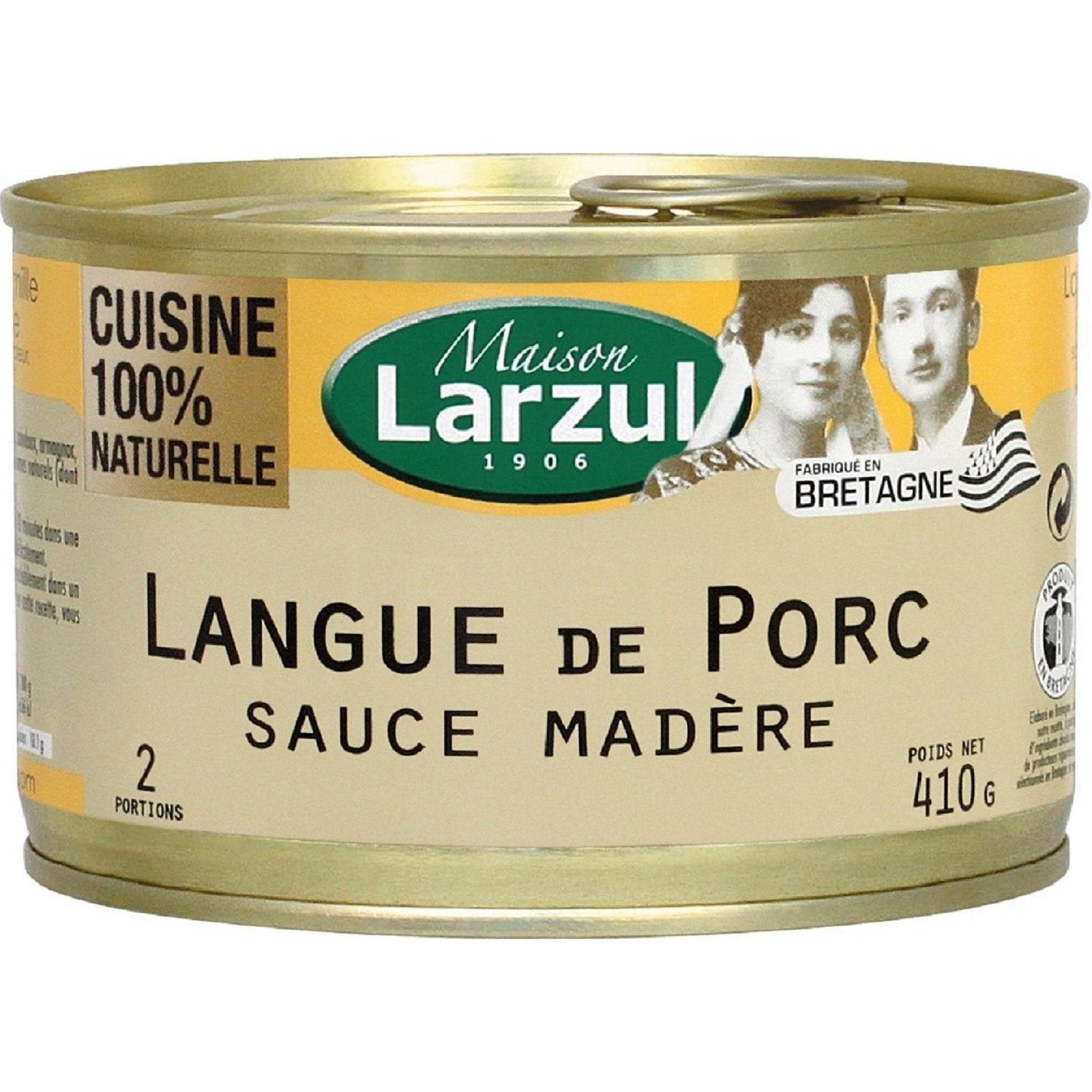 Zutaten: Schweinezunge (46%) (Herkunft: Frankreich). Sauce (54%): gefiltertes Wasser, WEIZENMEHL, Zwiebeln, BUTTER, Schmalz, Armagnac, Madeira (4%), Essig, Salz aus Guérande (1,8%), Zucker, Weißwein, Salz, natürliche Aromen (einschließlich SENF). Prozentangaben in der Sauce.