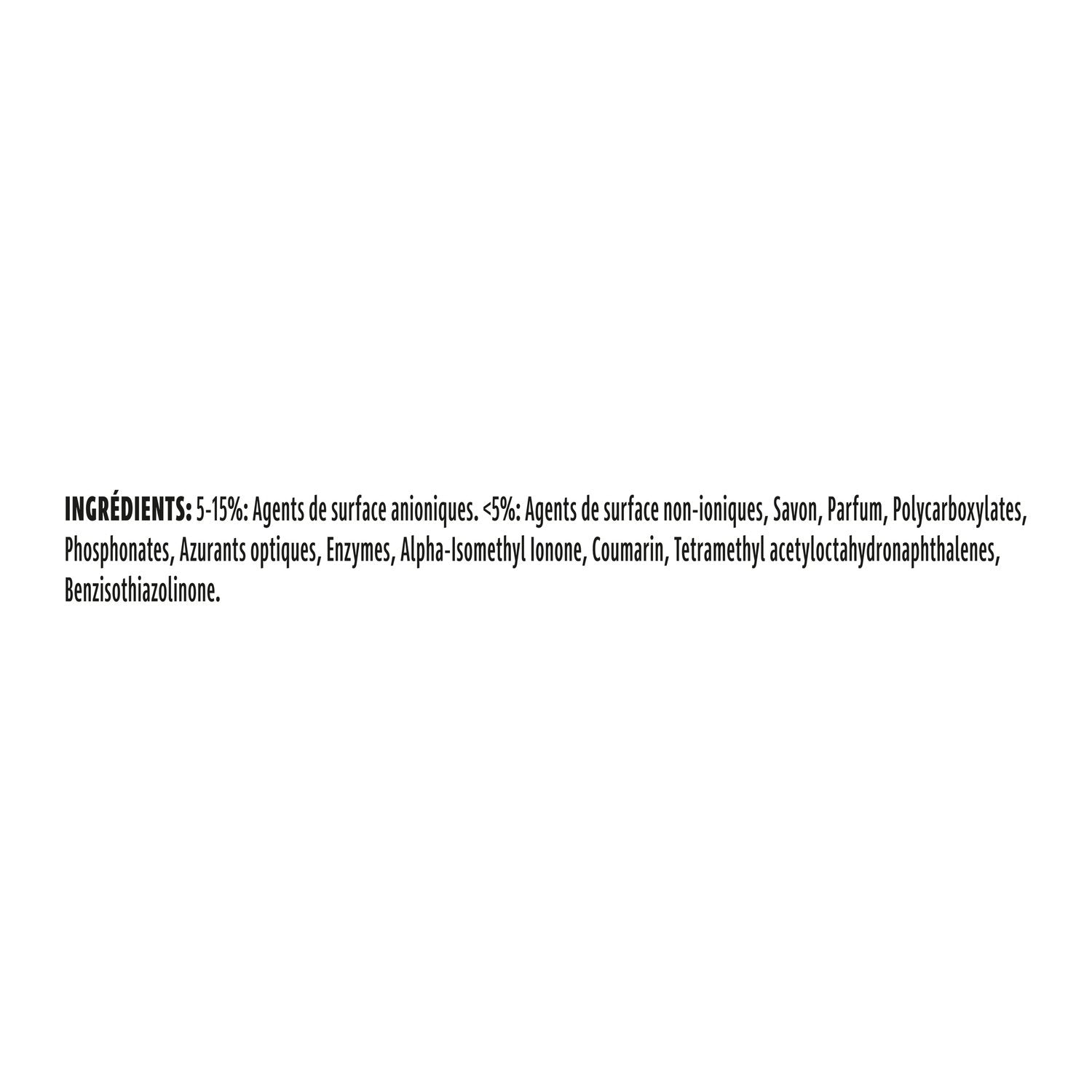 5–15 %: Anionische Tenside. <5 %: Nichtionische Tenside, Seife, Duftstoffe, Polycarboxylate, optische Aufheller, Phosphonate, Enzyme, Alpha-Isomethylionon, Cumarin, Tetramethylacetyloctahydronaphthaline, Methylisothiazolinon, Octylisothiazolinon.