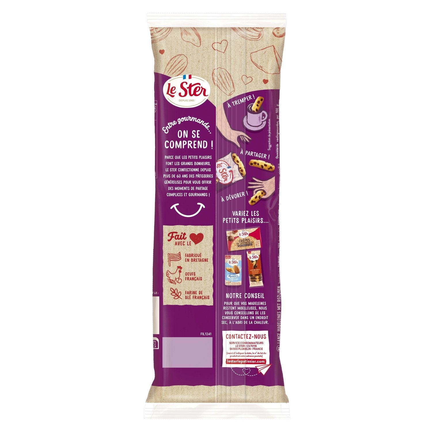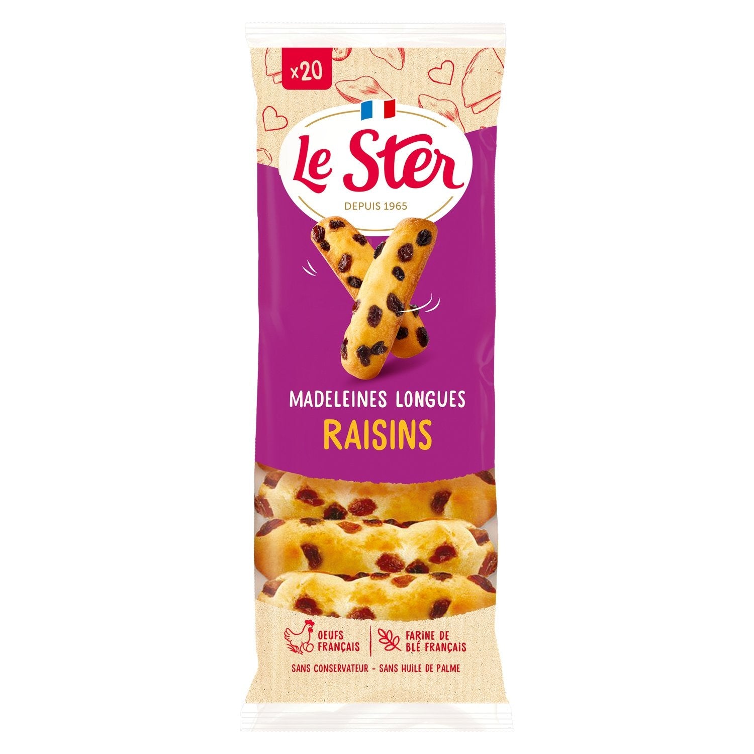 GENIESSEN SIE DIE LONG LE STER MADELEINE, DIE DIE WEICHHEIT EINER MADELEINE MIT DEM GUTEN GESCHMACK VON ROSINEN VERBINDET. IHR GEHEIMNIS? SIE WIRD AUS FRISCHEN EIERN UND FRANZÖSISCHEM WEIZENMEHL HERGESTELLT. GARANTIERT OHNE PALMÖL UND KONSERVIERUNGSSTOFFE WIRD SIE DIE GESCHMACKSKNOSPEN VON KINDERN UND ERWACHSENEN VERWÖHNEN. HERGESTELLT IN FRANKREICH.