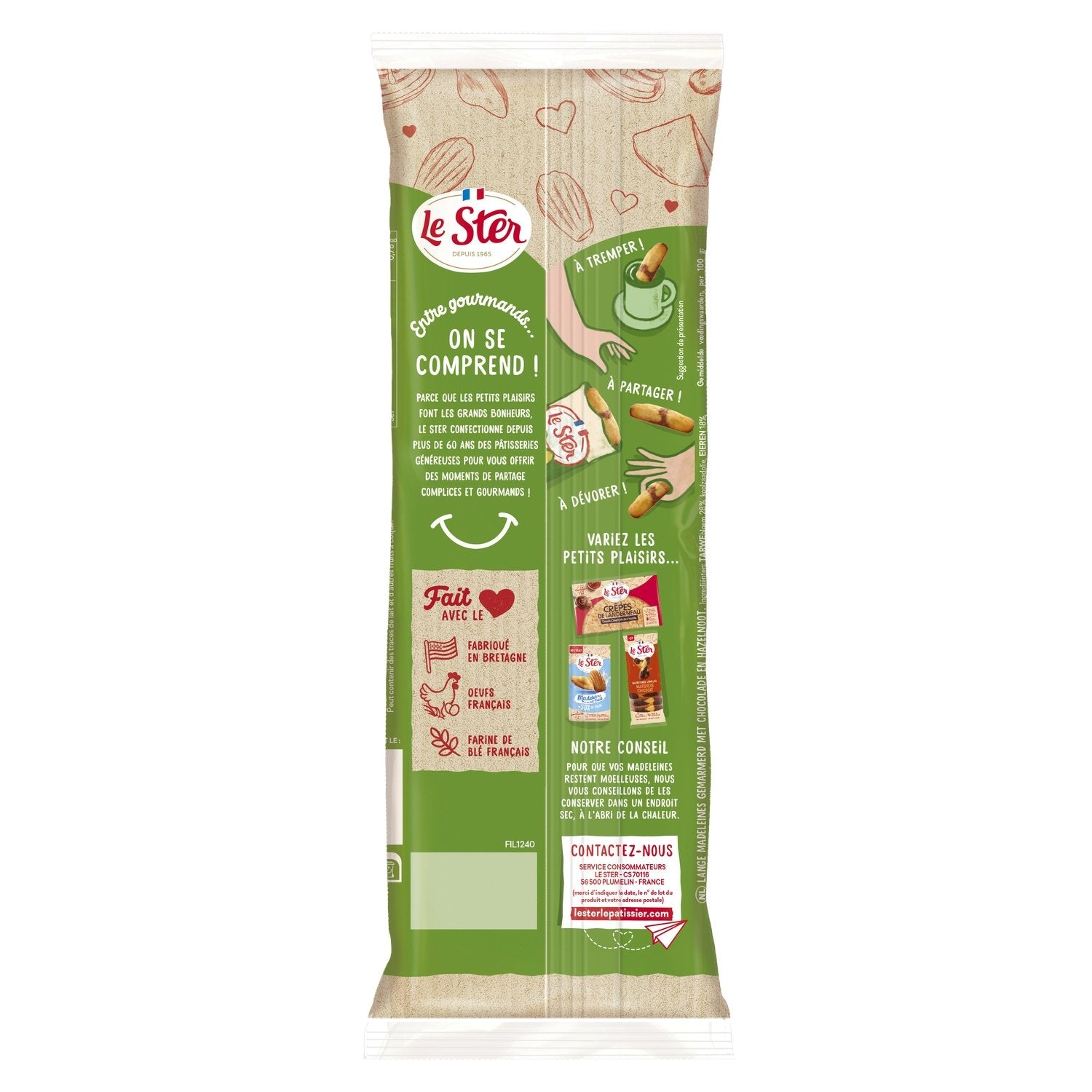 GENIESSEN SIE DIE LONG LE STER MADELEINE MIT DEM KÖSTLICHEN GESCHMACK VON SCHOKOLADE UND HASELNÜSSEN. IHR GEHEIMNIS? SIE WIRD AUS FRISCHEN EIER UND FRANZÖSISCHEM WEIZENMEHL HERGESTELLT, GARANTIERT OHNE PALMÖL UND KONSERVIERUNGSSTOFFE. DANK IHRER WEICHHEIT WIRD SIE DIE GESCHMACKSKNOSPEN VON KINDERN UND ERWACHSENEN VERWÖHNEN. HERGESTELLT IN FRANKREICH.