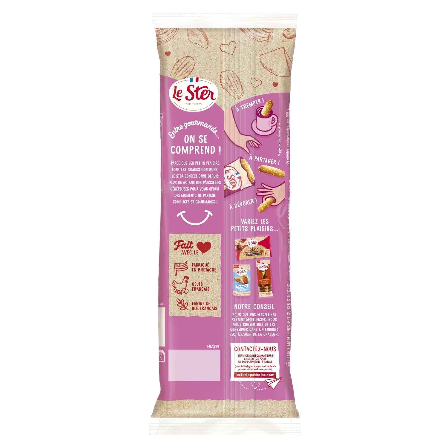 GENIESSEN SIE DIE LE STER LONG MADELEINE, DIE DIE WEICHHEIT EINER MADELEINE MIT KNUSPRIGEN ZUCKERSTÜCKEN VERBINDET. IHR GEHEIMNIS? SIE WIRD AUS FRISCHEN EIERN UND FRANZÖSISCHEM WEIZENMEHL HERGESTELLT. GARANTIERT OHNE PALMÖL UND KONSERVIERUNGSSTOFFE WIRD SIE DIE GESCHMACKSKNOSPEN VON KINDERN UND ERWACHSENEN VERWÖHNEN. HERGESTELLT IN FRANKREICH.