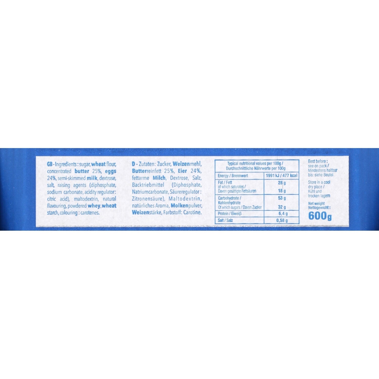 Zutaten: Zutaten: CRC®* WEIZENmehl (30%), Zucker, frische EIER aus Freilandhaltung (23%), Backbutter (22%), teilentrahmte MILCH, Dextrose, Salz, Backtriebmittel (Diphosphate, Natriumcarbonate), Säureregulator: Zitronensäure, Maltodextrin, WEIZENstärke, MOLKENpulver, natürliches Aroma, Farbstoff: Carotinoide. *CRC®: Kontrolliert nachhaltige Landwirtschaft
