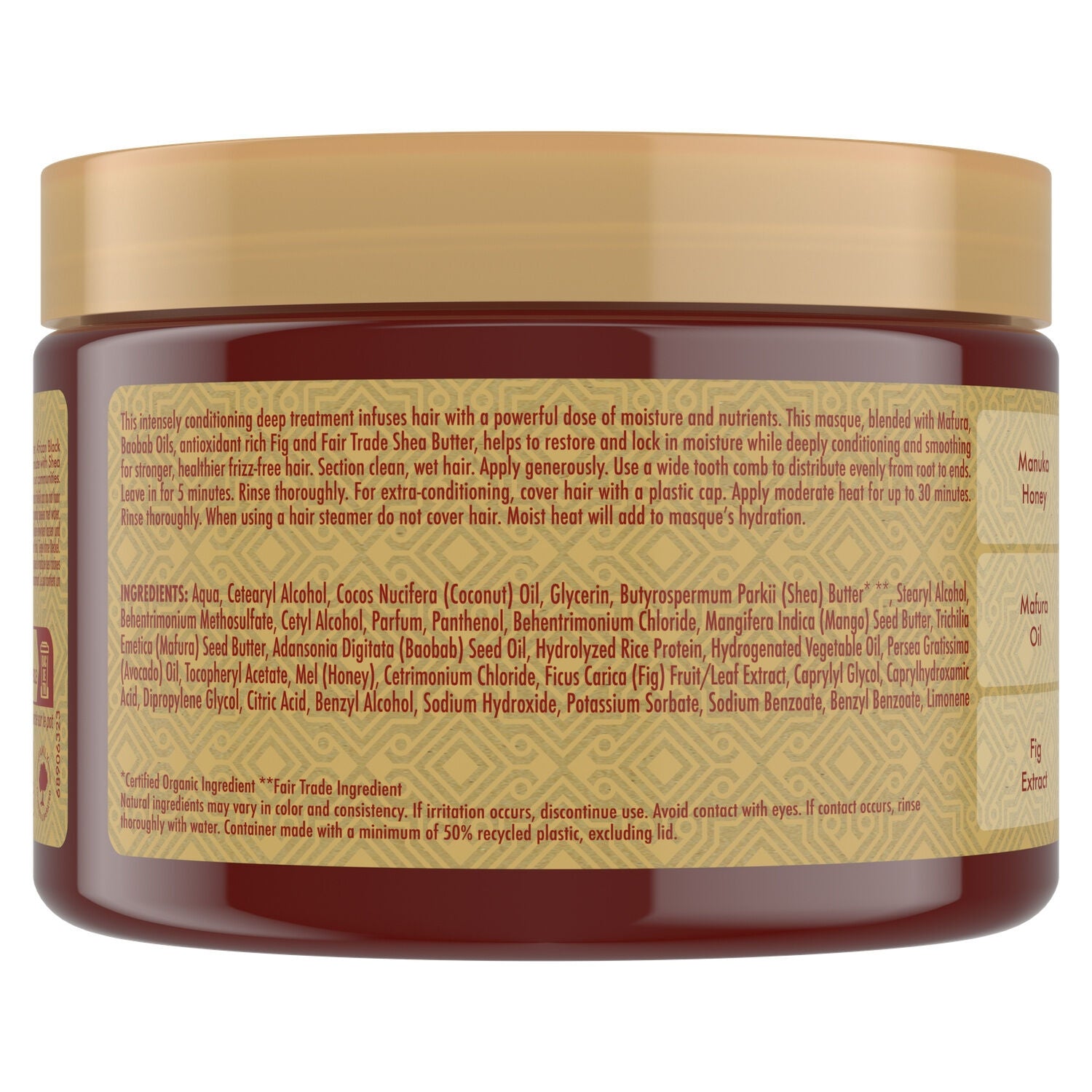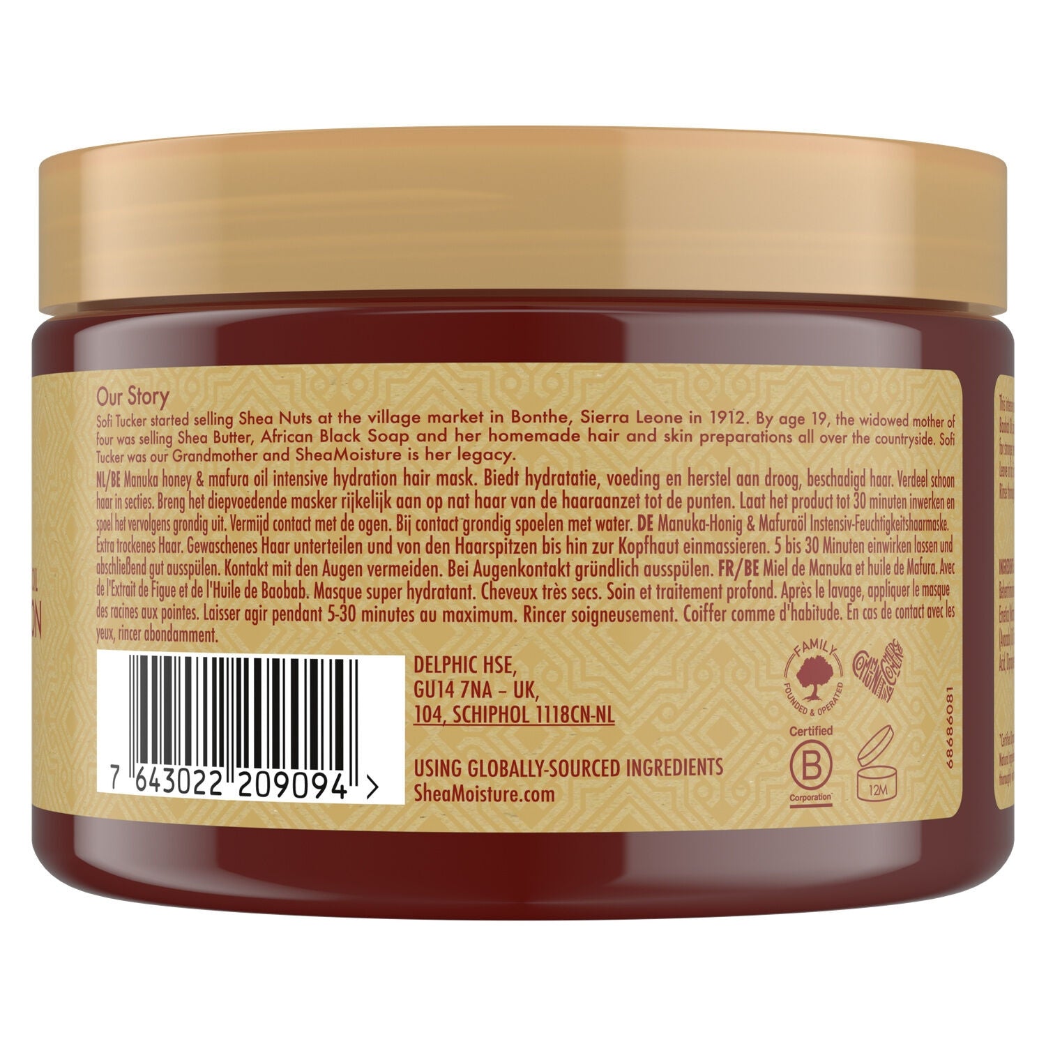 Die Shea Moisture Manuka Honey & Mafura Oil Haarmaske für Frauen spendet geschädigtem Haar intensiv Feuchtigkeit.,Angereichert mit regenerierenden Ölen spendet diese Maske trockenem und geschädigtem Haar Feuchtigkeit und regeneriert es.,Sie ist eine der besten Shea Moisture Masken zur Revitalisierung und Pflege von Haartyp 4.Formuliert ohne Sulfate für eine sanftere Pflege Ihres Haares und ohne Silikone für natürliches Volumen.,Alle Shea Moisture Haarprodukte werden nachhaltig mit Fair-Trade-Sheabutter hergestellt und enthalten keine Inhaltsstoffe, die an Tieren getestet wurden.,Entdecken Sie zur Vervollständigung Ihrer Pflegeroutine das Shea Moisture Manuka Honey & Mafura Oil Shampoo und die Spülung in derselben Serie.