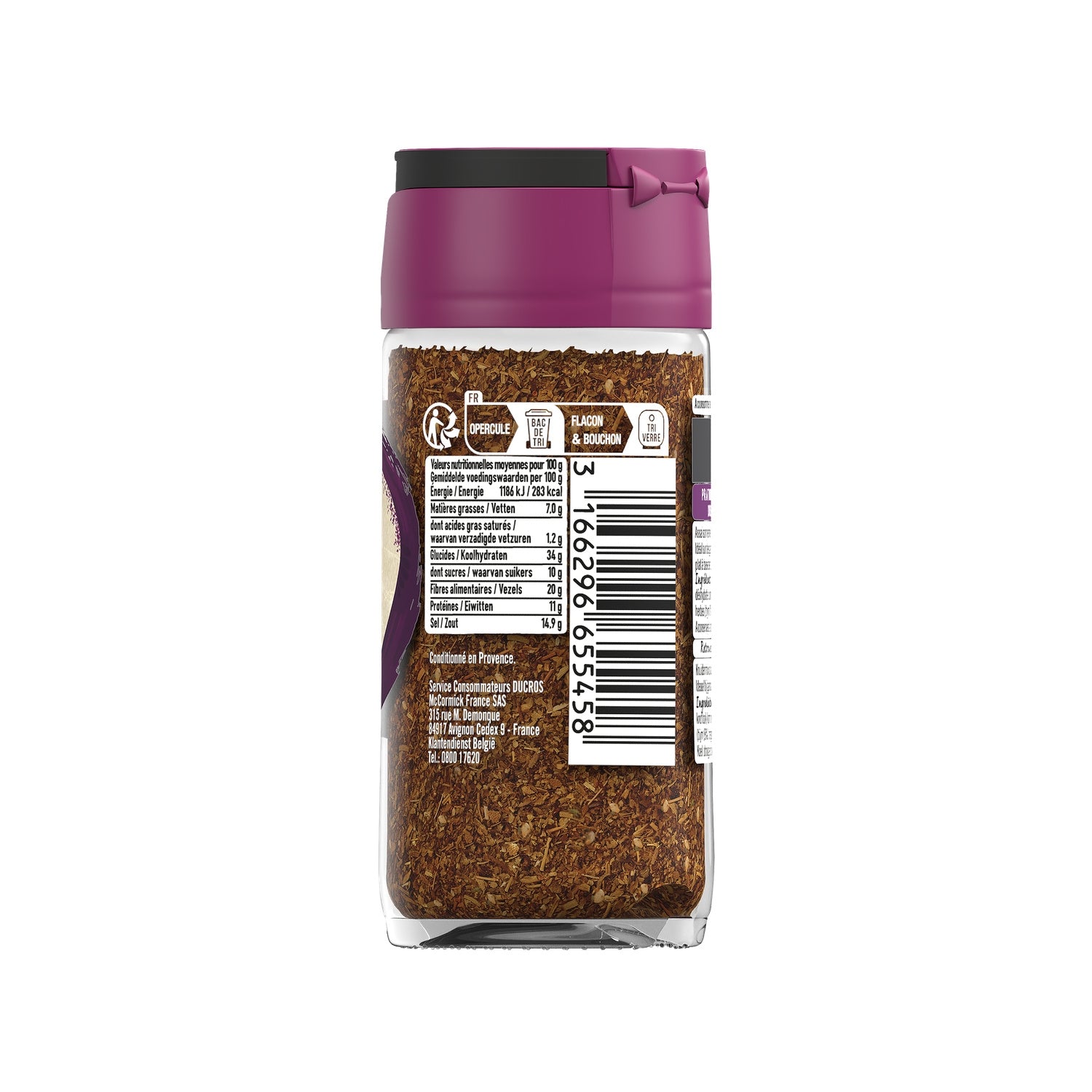 Zutaten: Gewürze (Paprika (25%), getrocknete Zwiebeln, getrockneter Knoblauch, Kreuzkümmel, schwarzer Pfeffer, Cayennepfeffer (3%)), Salz (15%), Kräuter (Thymian (8%), Oregano), Zuckerrohrfasern.